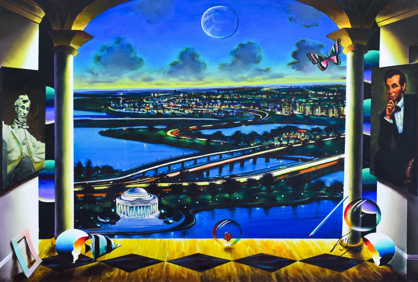 Artist: Ferjo. Medium: Original Oil on Canvas. Title: Lincoln Over Looking. Size (Unframed): 30" x 40". Size (Framed): 37" x 47". Certificate of Authenticity: Is included. Additional: Custom framed. Reference# 14612.