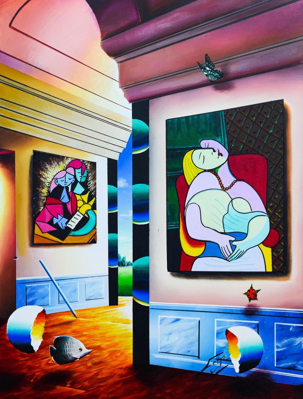 Artist: Ferjo. Medium: Original Oil on Canvas. Title: Picasso's Room of Beauty. Size (Unframed): 40" x 30". Size (Framed): 47" x 36". Certificate of Authenticity: Is included. Additional: Custom framed. Reference# 14607.