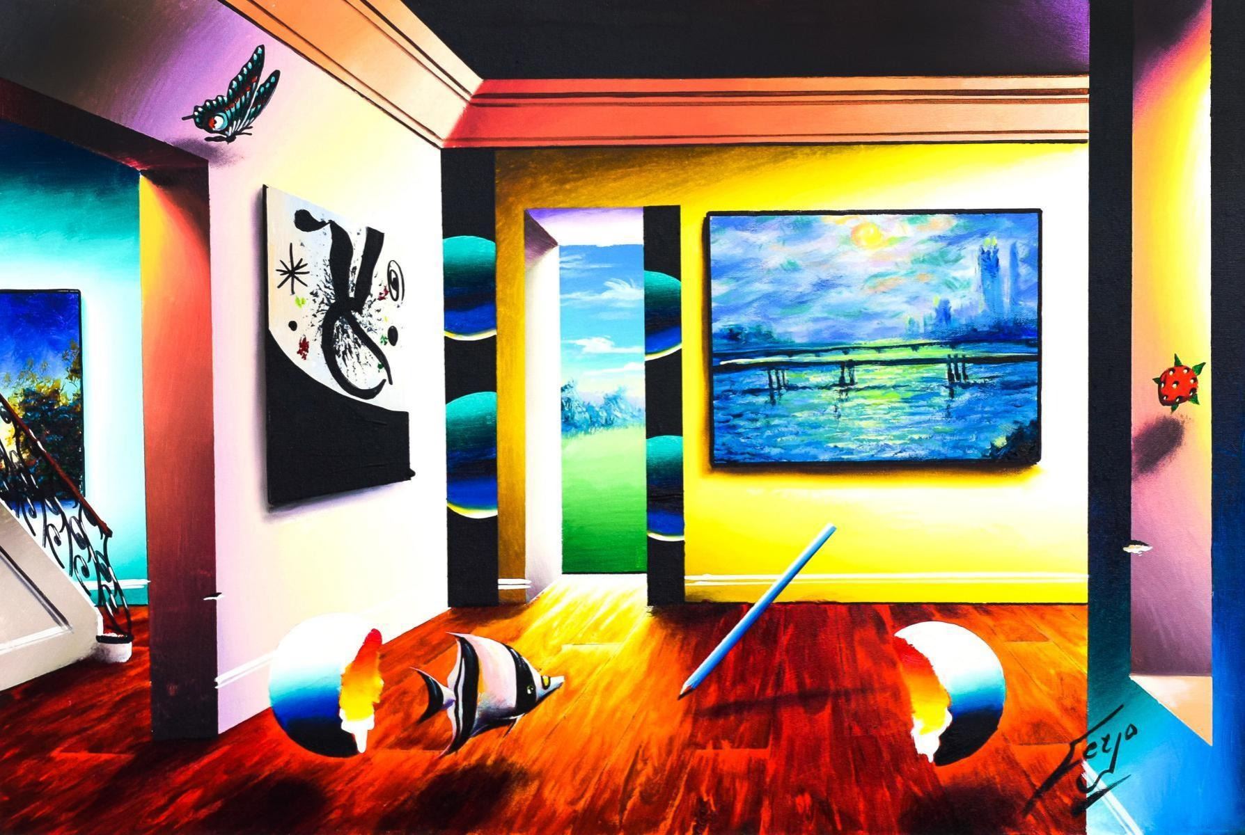 Artist: Ferjo. Medium: Original Oil on Canvas. Title: Sun Over Bridge. Size (Unframed): 24" x 36". Size (Framed): 32" x 44". Certificate of Authenticity: Is included. Additional: Custom framed. Reference# 15980.