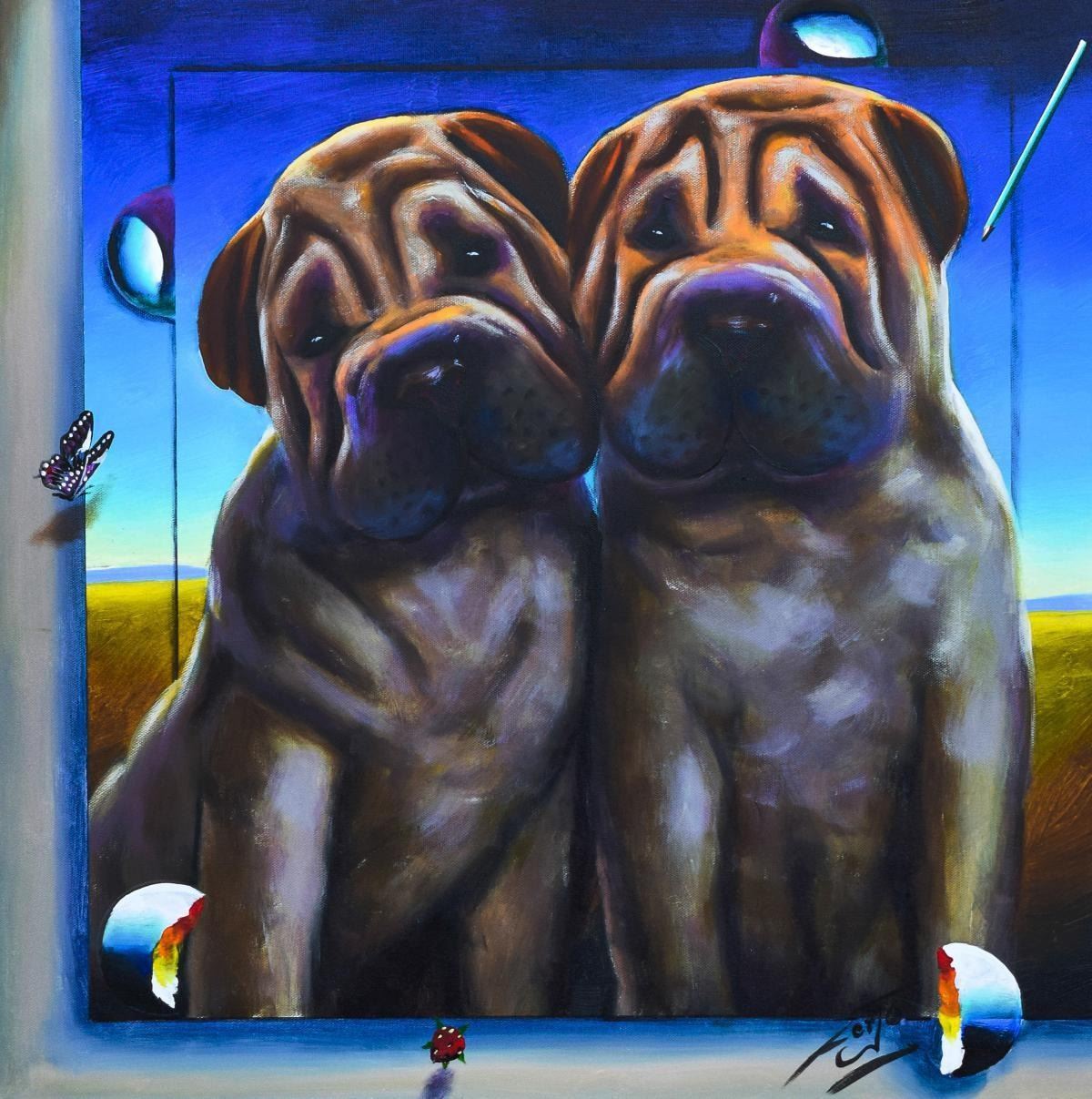 Artist: Ferjo. Medium: Original Oil on Canvas. Title: Two Shar Pei Puppies. Size (Unframed): 24" x 24". Size (Framed): 30" x 30". Certificate of Authenticity: Is included. Additional: Custom framed. Reference# 14621.