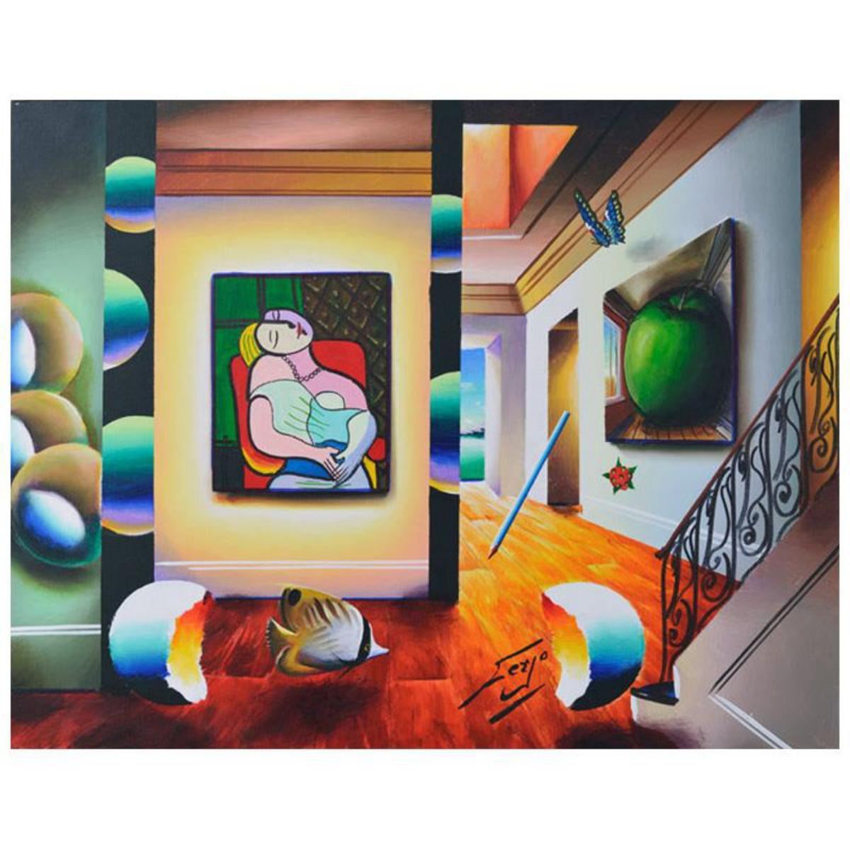 "Picasso Meets Magritte" is an original painting, oil on stretched canvas, by Ferjo. Hand signed by the artist, this piece comes with a letter of authenticity. Measures approx. 22" x 28" (image). Reference #: 242399
