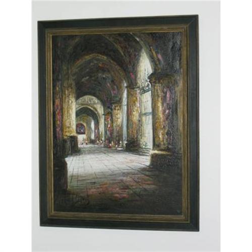 The painting depicts an interior church scene of the Cathedral Burgos of Spain, by which you are drawn down a corridor of illumination and vibrating pillars within the darkened shadows ! The cathedral's construction began in