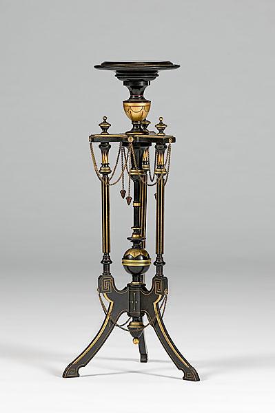 New York, ca 1870, Renaissance revival ebonized and gilt incised fern stand. Attributed to Kilian Bros., New York. Stepped top on a turned stem with buttress supports on canted legs over stylized hoofed feet; 39.5" high x 10.75" diameter of top x 17" at base.