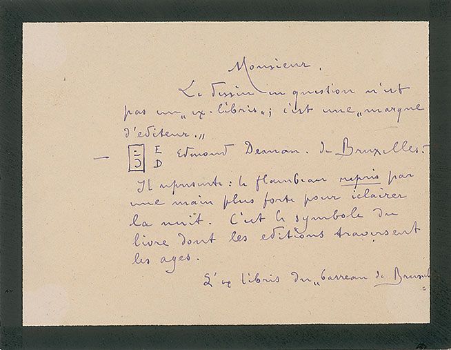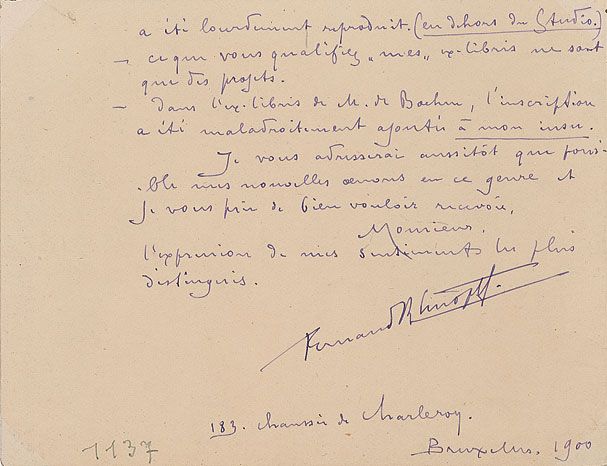 Belgian symbolist painter (1858–1921). ALS, one page both sides, 4.5 x 3.5, black-bordered letterhead, 1900. Untranslated letter to an unidentified recipient, mentioning the art magazine The Studio, and stating, “The design in question is not a 'bookplate,’”with a small drawing incorporated within the text. In fine condition.