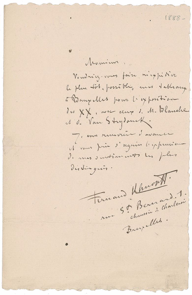 Belgian symbolist painter (1858–1921). Untranslated ALS in French, one page, 4.5 x 7, no date. Pencil notation in upper left corner indicates the year the signature was obtained, “1888.” In fine condition.