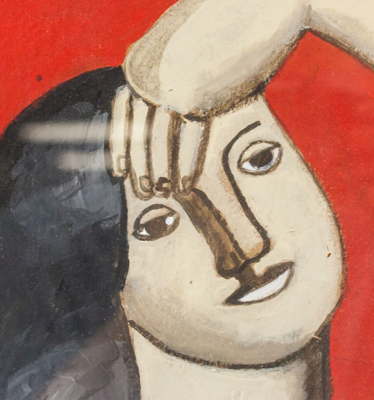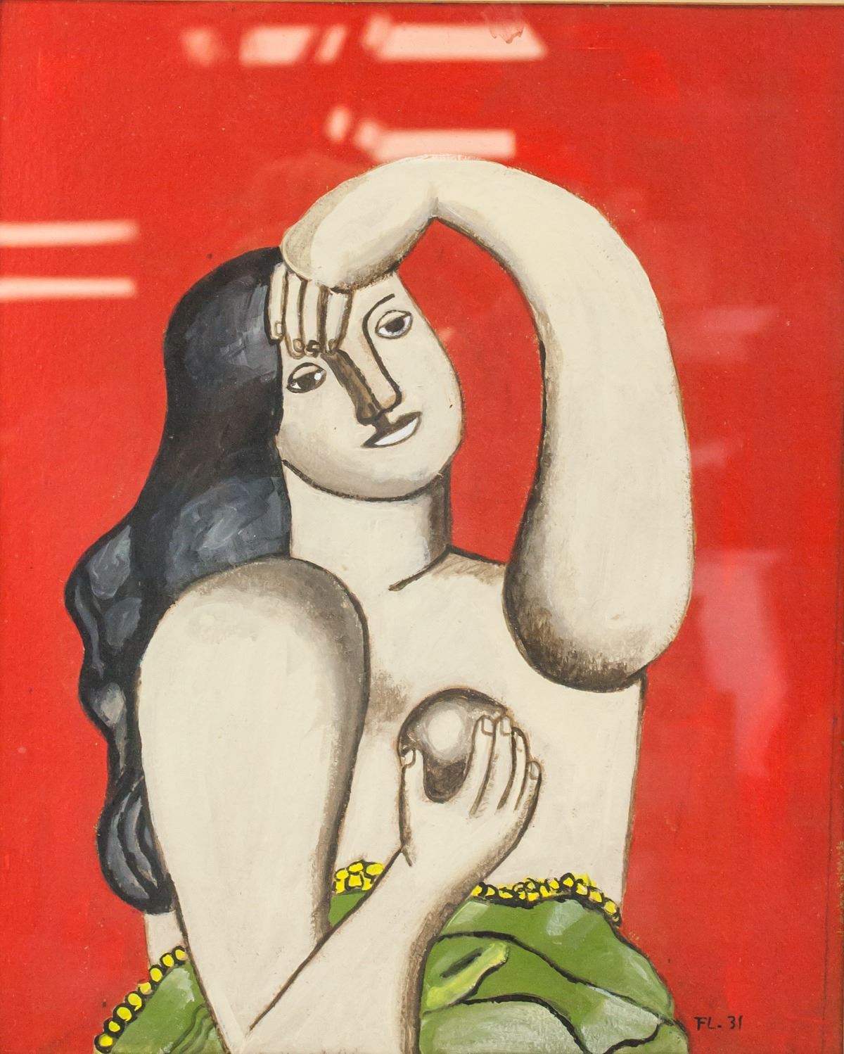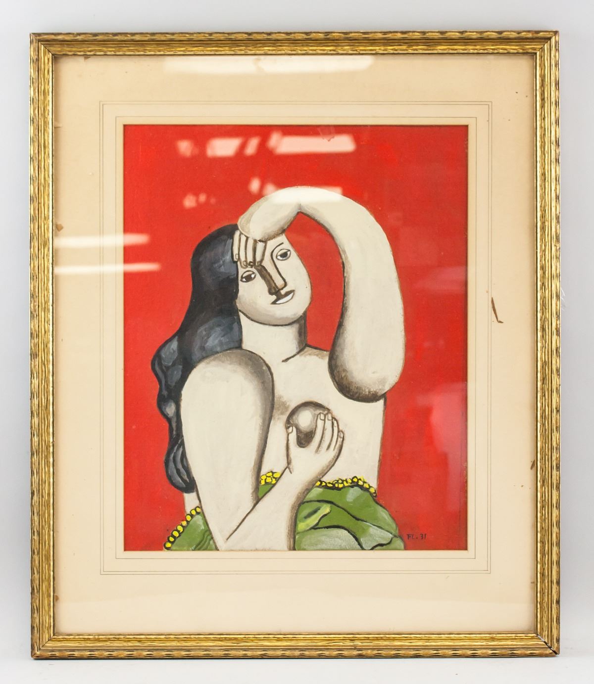 Acrylic on paper, framed. Featuring a cubist portrait of nude woman holding fruit. Signed FL. and inscribed 31 beside signature on the lower right corner.Stamped MUSEE FERNAND LEGER on verso. Gallery label affixed to verso inscribed GALERIE LOUIS CARRE & CO / 10, Avenue de Messine, Paris-VIIIe and inscribed underneath Fernand Leger / "La Femme" / HHuile sur papier / 44 cm. x 36cm. Attributed to Fernand Leger (1881-1955, French). 44 x 35 cm (17.25 x 13.75 inches). Framed size: 66 x 55 cm (26 x 21.25 inches). PROVENANCE: This lot carries limited provenance from a Southern Ontario estate