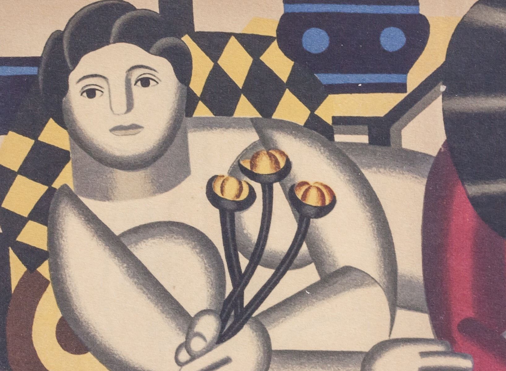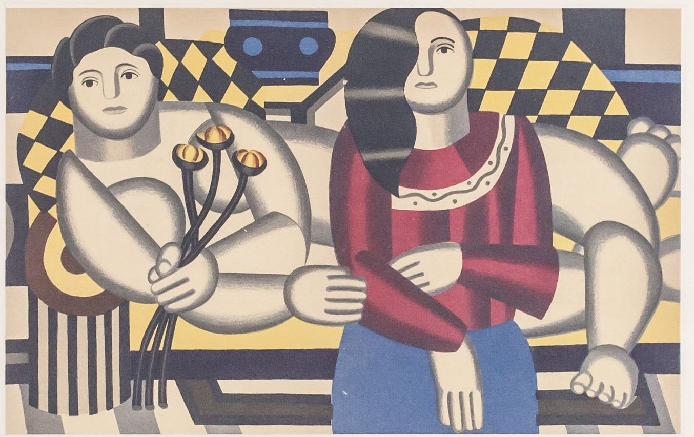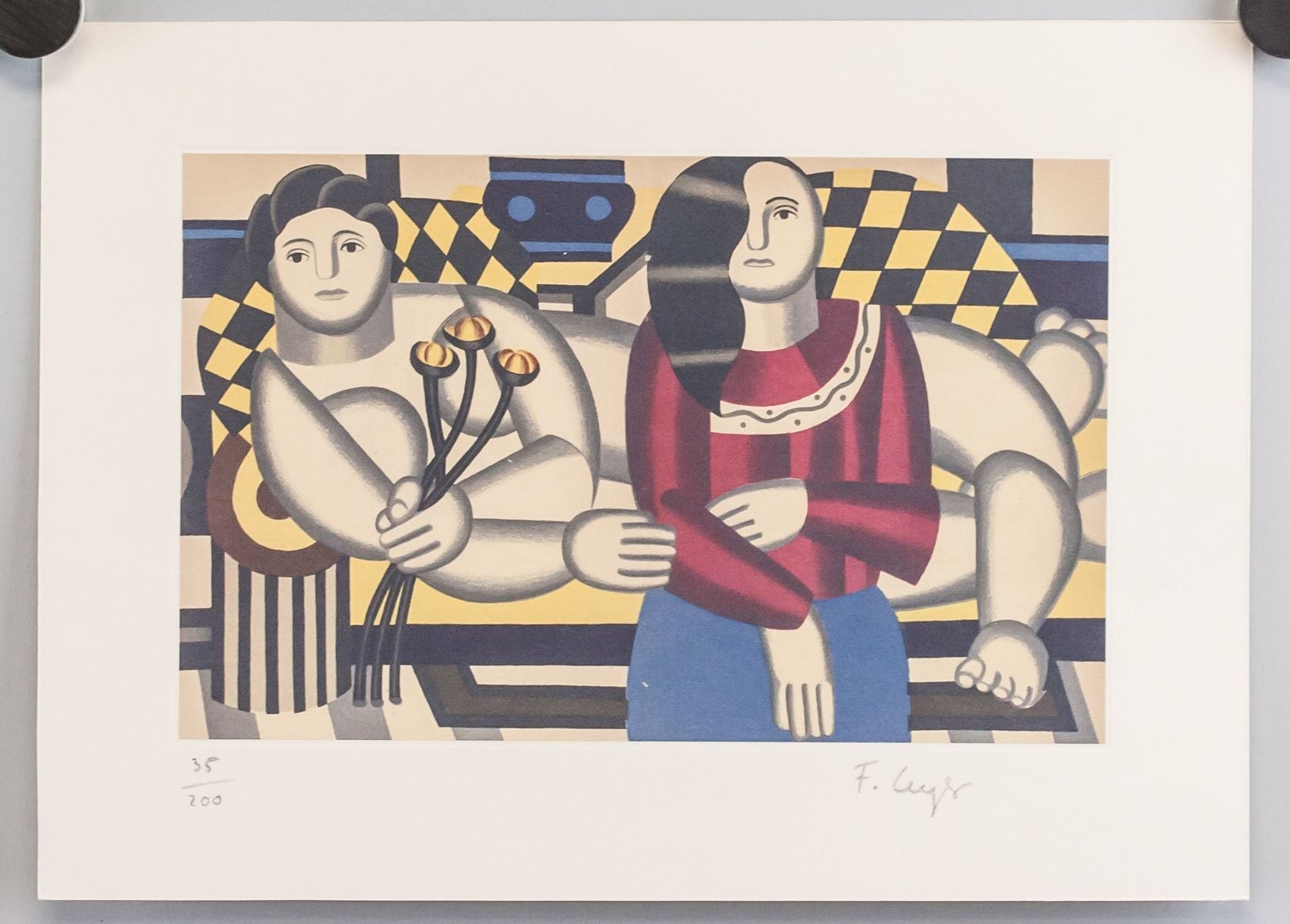 Linocut on paper. Featuring one woman lying across a cough with another sitting in front. "35/200" inscribed to the bottom left. Signed "F. Leger" to the bottom right. Attributed to Fernand Leger (1881-1955, French). Image size: 14 x 22 cm (5.5 x 8.75 inches). Sheet size: 21 x 29 cm (8.25 x 11.75 inches). Provenance: This lot carries limited provenance from a Southern Ontario estate.