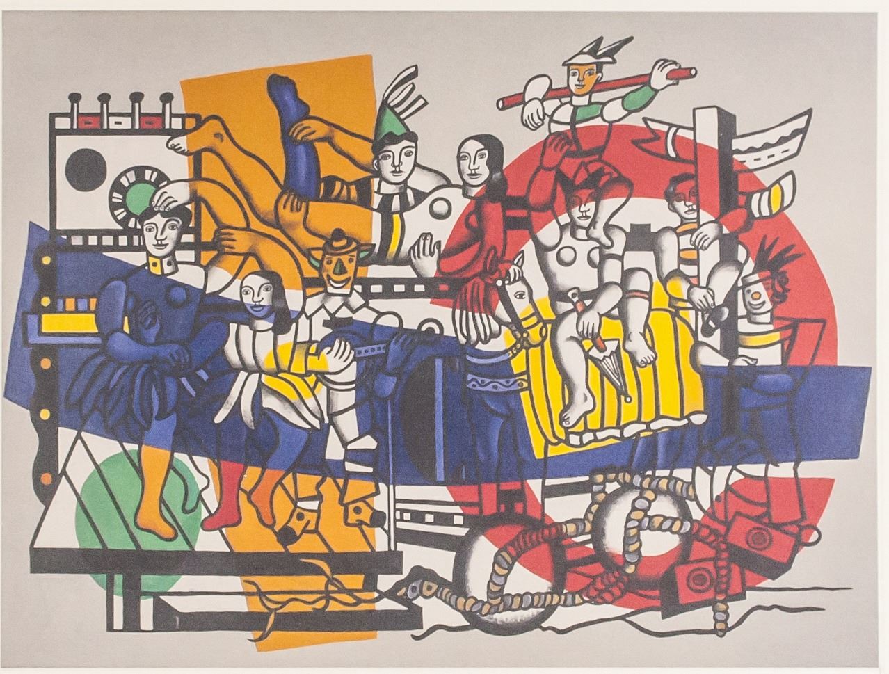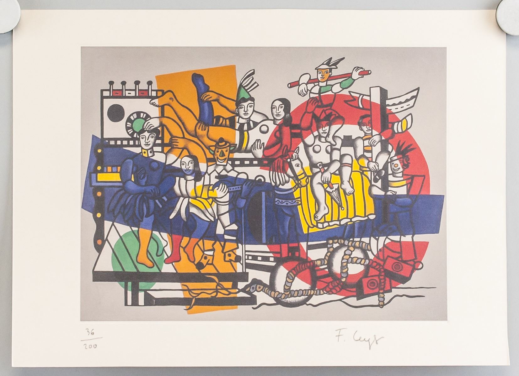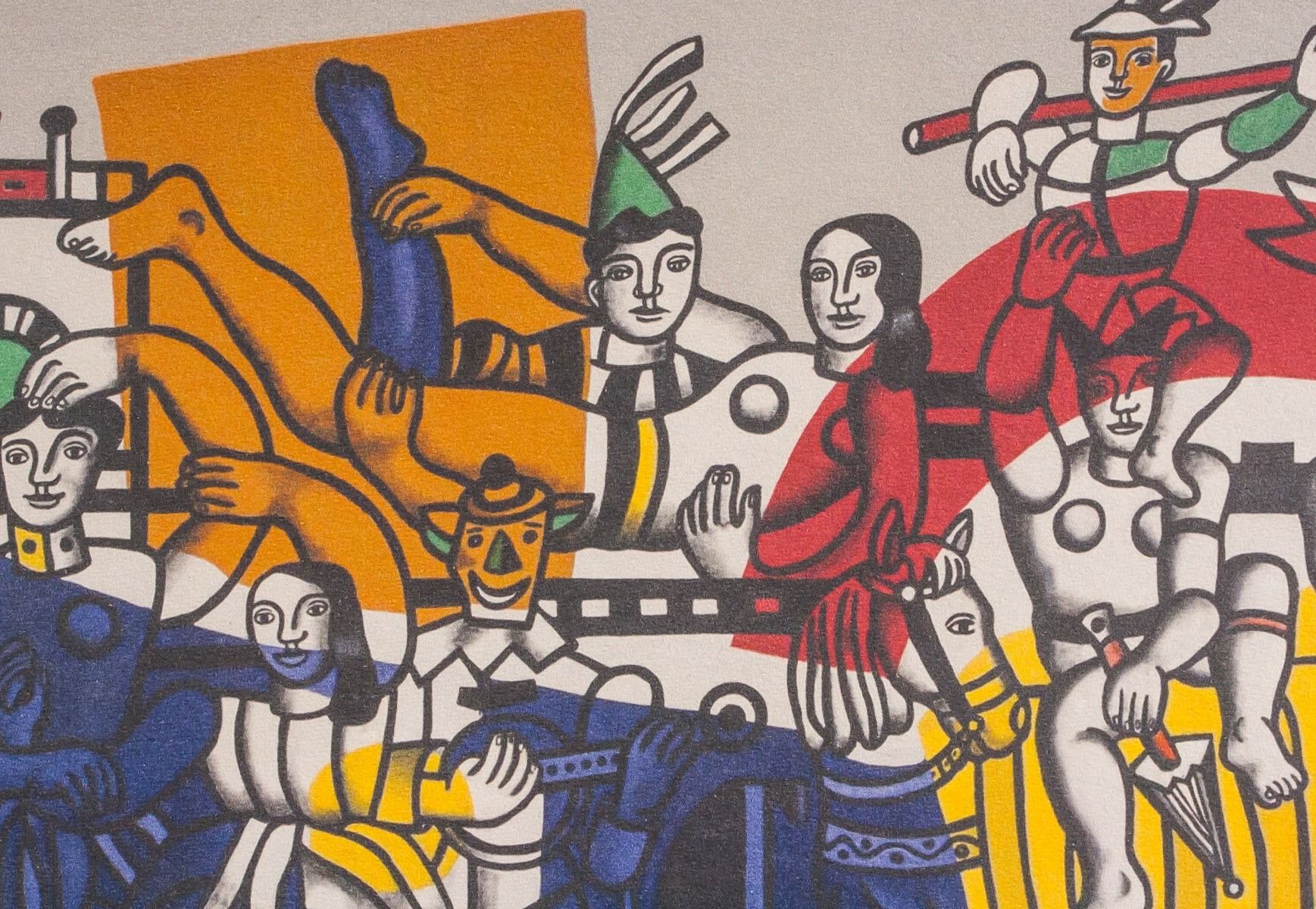 Linocut on paper. Featuring collage of figures in a variety of poses superimposed over bold blocks of color. "36/200" inscribed to the bottom left. Signed "F. Leger" to the bottom right. Attributed to Fernand Leger (1881-1955, French). Image size: 17.5 x 14 cm (7 x 5.75 inches). Sheet size: 28.5 x 21 cm (11.25 x 8.2 inches).