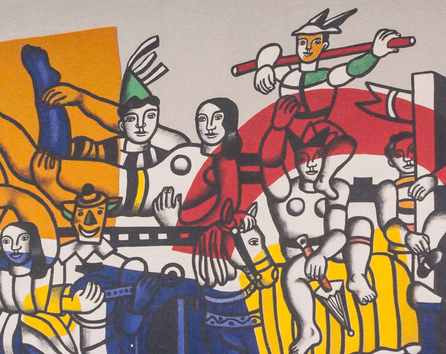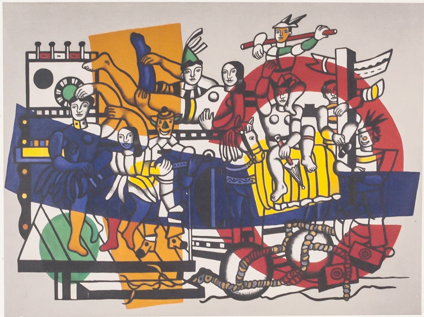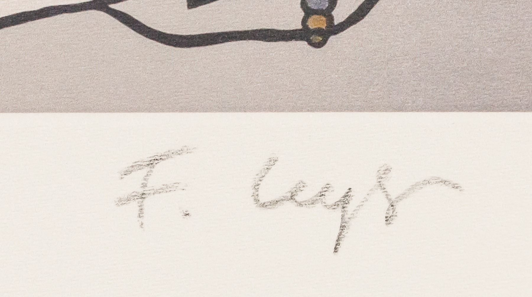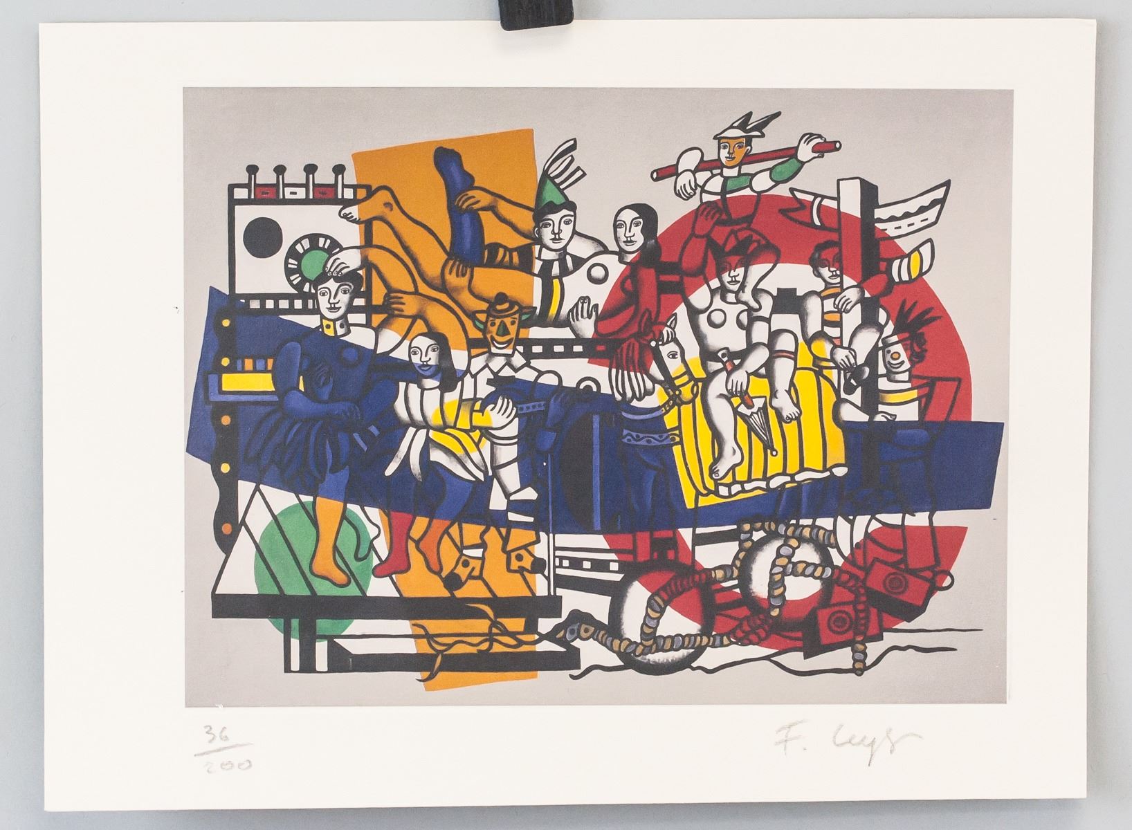 Lithogrpah on paper. Featuring a group of figures all in different poses. Overlaid with colored geometric shapes. Signed "F. Leger" in the bottom right corner, with "36/200" inscribed in the bottom left corner. Attributed to Fernand Leger (1881-1955, French). 20.5 x 27.5 cm (8 x 10.75 in).