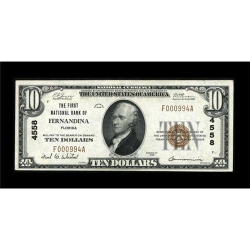 <B>Fernandina, FL</B></I> - $10 1929 Ty. 1 <B>The First NB</B></I> Ch. # 4558<BR> Quite a lovely representative from here. Three folds and some subtle handling account for the grade. <B>Very Fine-Extremely Fine.</B></I><BR><I>From The Amelia Island Collection.</B></I><BR><BR><b>Shipping:</b> Coins & Currency (<a target="_blank" href="http://www.heritageauctions.com/common/shipping.php">view shipping information</a>)