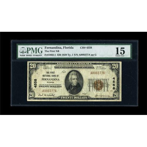 <B>Fernandina, FL</B></I> - $20 1929 Ty. 1 <B>The First NB</B></I> Ch. # 4558<BR> An attractive Series 1929 example which was last sold in a midwest auction as Very Fine. It has been graded, and very conservatively at that, as <B>Choice Fine 15</B></I> by PMG, a designation that even the most picky of collectors would likely not dispute. <BR><I>From The Sunshine State Collection.</B></I><BR><BR><b>Shipping:</b> Coins & Currency (<a target="_blank" href="http://www.heritageauctions.com/common/shipping.php">view shipping information</a>)