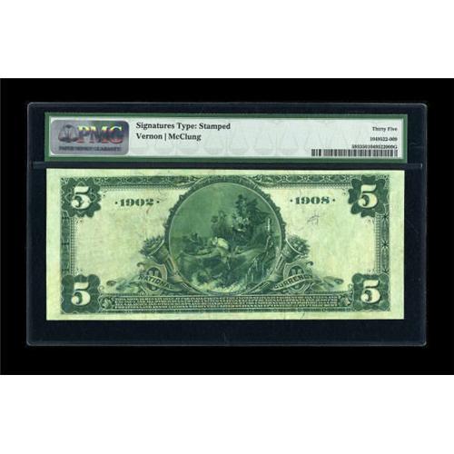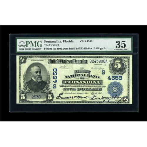 <B>Fernandina, FL</B></I> - $5 1902 Date Back Fr. 593 <B>The First NB</B></I> Ch. # (S)4558<BR> Only about a dozen large examples are known from this bank, with this piece both new to the census and the only Date Back of any denomination reported from here to date. It's also the finest known large note from here by a very considerable margin, grading a strong PMG <B>Choice Very Fine 35</B></I> with bold black signatures and loads of eye appeal. With the last sales of large notes from here garnering prices in the range of $3200 to nearly $5000, expect this much superior example to easily reach and very likely exceed...<BR><I>From The Sunshine State Collection.</B></I><BR><BR><b>Shipping:</b> Coins & Currency (<a target="_blank" href="http://www.heritageauctions.com/common/shipping.php">view shipping information</a>)