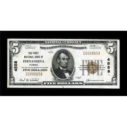 <B>Fernandina, FL</B></I> - $5 1929 Ty. 1 <B>The First NB</B></I> Ch. # 4558<BR> This is a bright pleasing <B>Very Fine-Extremely Fine </B></I>example from this elusive bank.<BR><I>From The Amelia Island Collection.</B></I><BR><BR><b>Shipping:</b> Coins & Currency (<a target="_blank" href="http://www.heritageauctions.com/common/shipping.php">view shipping information</a>)