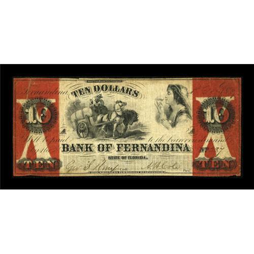<B>Fernandina, FL- Bank of Fernandina </B></I>$10 Dec. 1, 1859 G4a Freeman 5<BR> A scarce note in this denomination, and one with plenty of eye appeal as well, with a bright red overprinted protector at each end. <B>Fine.</B></I><BR><I>From The Collection of a Louisiana Gentleman.</B></I><BR><BR><b>Shipping:</b> Coins & Currency (<a target="_blank" href="http://www.heritageauctions.com/common/shipping.php">view shipping information</a>)