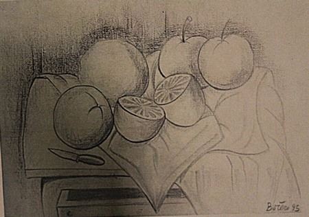 in the manner of Fernando Botero "Bodegon Con Frutas" drawing on paper circa.1995, private collection Approx. 30x21cm. in the manner of Fernando Botero is a Colombian artist known for creating bloated, oversized depictions of people, animals and elements of the natural world. Botero left matador school to become an artist, displaying his work for the first time in a 1948. His subsequent art, now exhibited in major cities worldwide, concentrates on situational portraiture united by his subjects' proportional exaggeration.