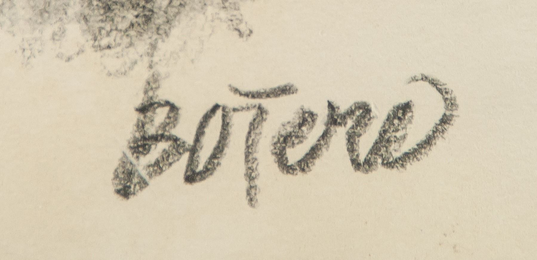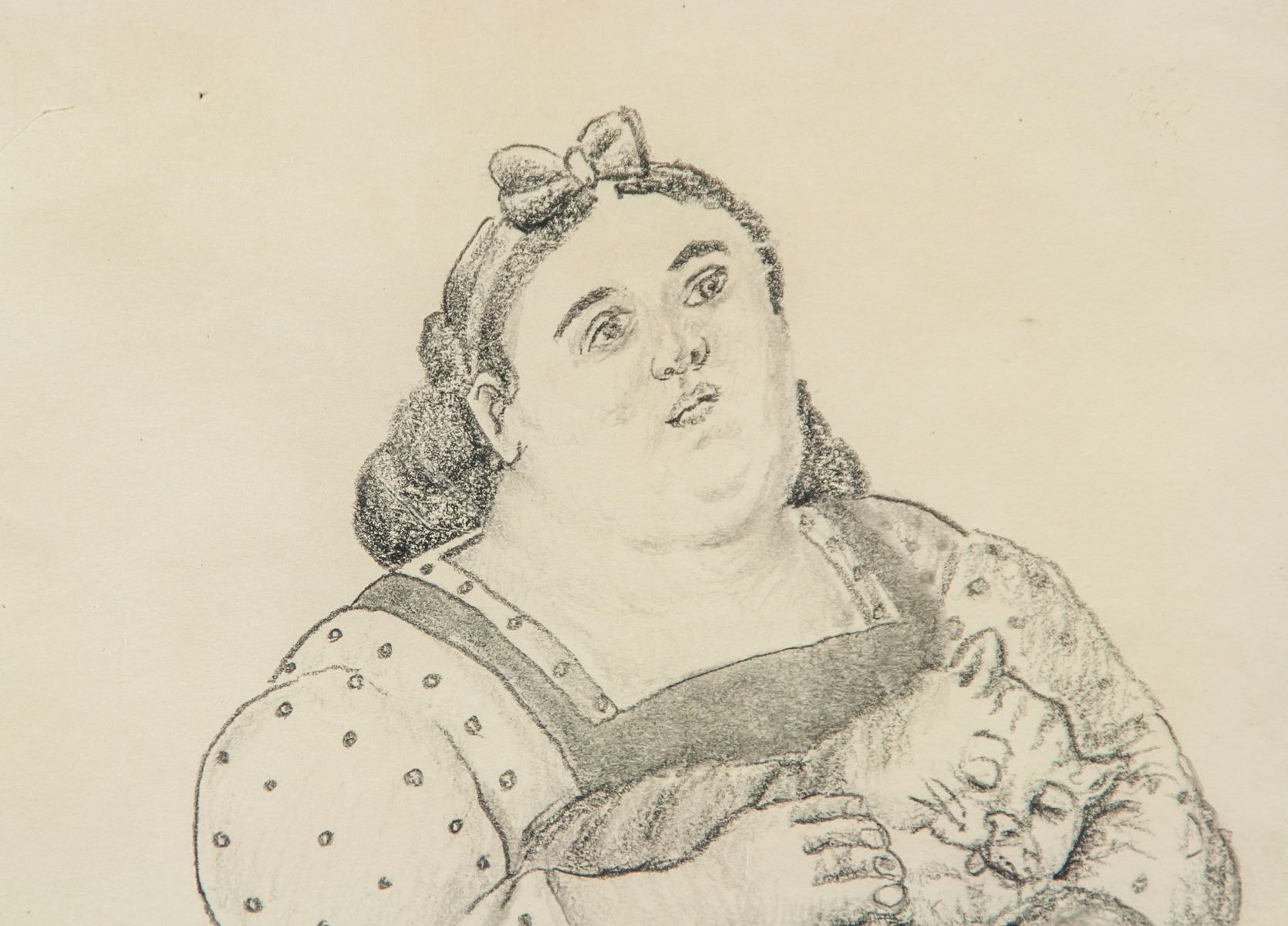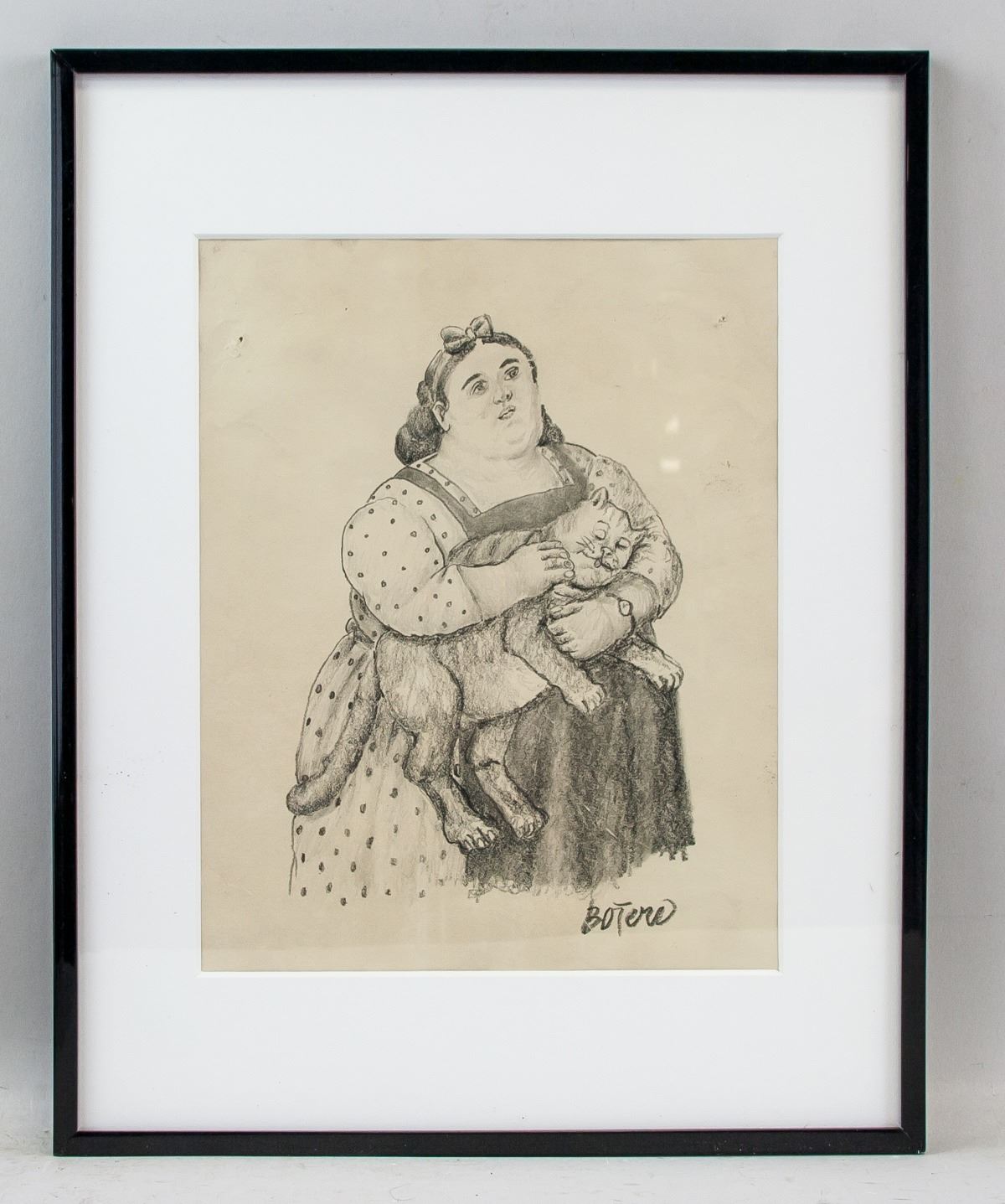 Pencil on paper, framed, featuring a seated woman holding a cat. Signed Botero on the lower right corner. Attributed to Fernando Botero (born 1932, Colombian). 24 x 19 cm (9.4 x 7.5 inches), Frame: 36.5 x 29 cm (14.4 x 11.4 inches)