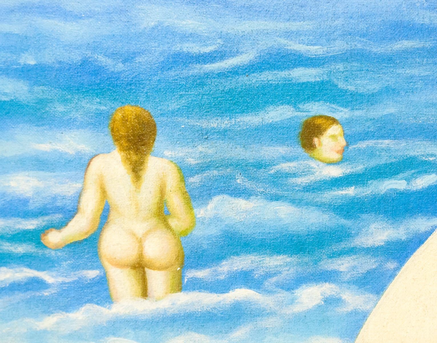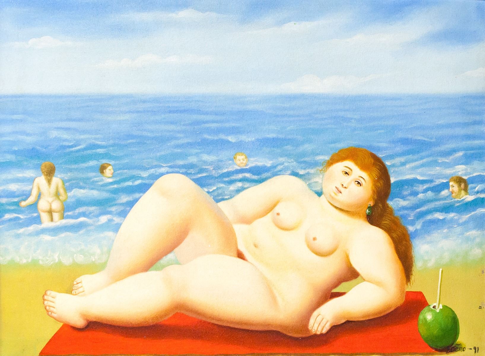 Oil on canvas, framed. Featuring a nude woman lying on the beach, on a red towel. A green coconut rests beside her with a straw poking out. Signed "Botero" in the bottom right corner. With "91" inscribed beside the signature. Attributed to Fernando Botero (1932- , Colombian). 60 x 80 cm (23.5 x 31.5 in), Frame: 69 x 89 cm (27 x 35 in).