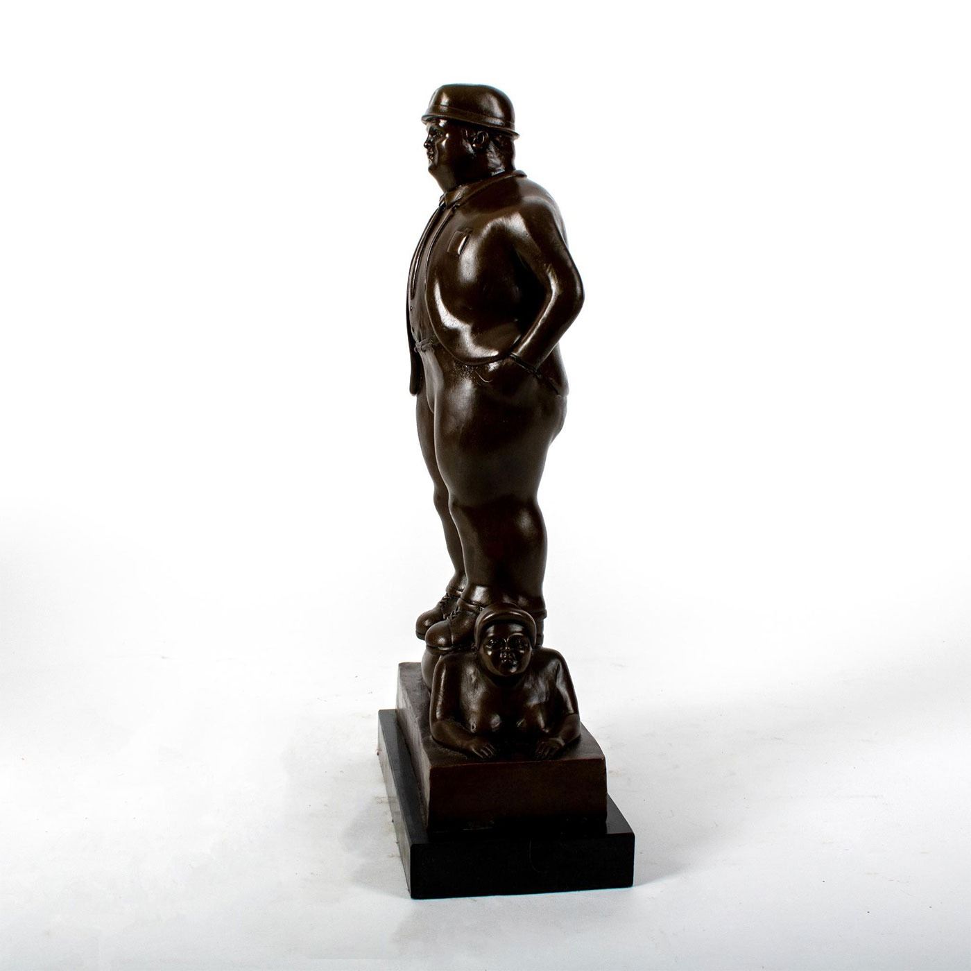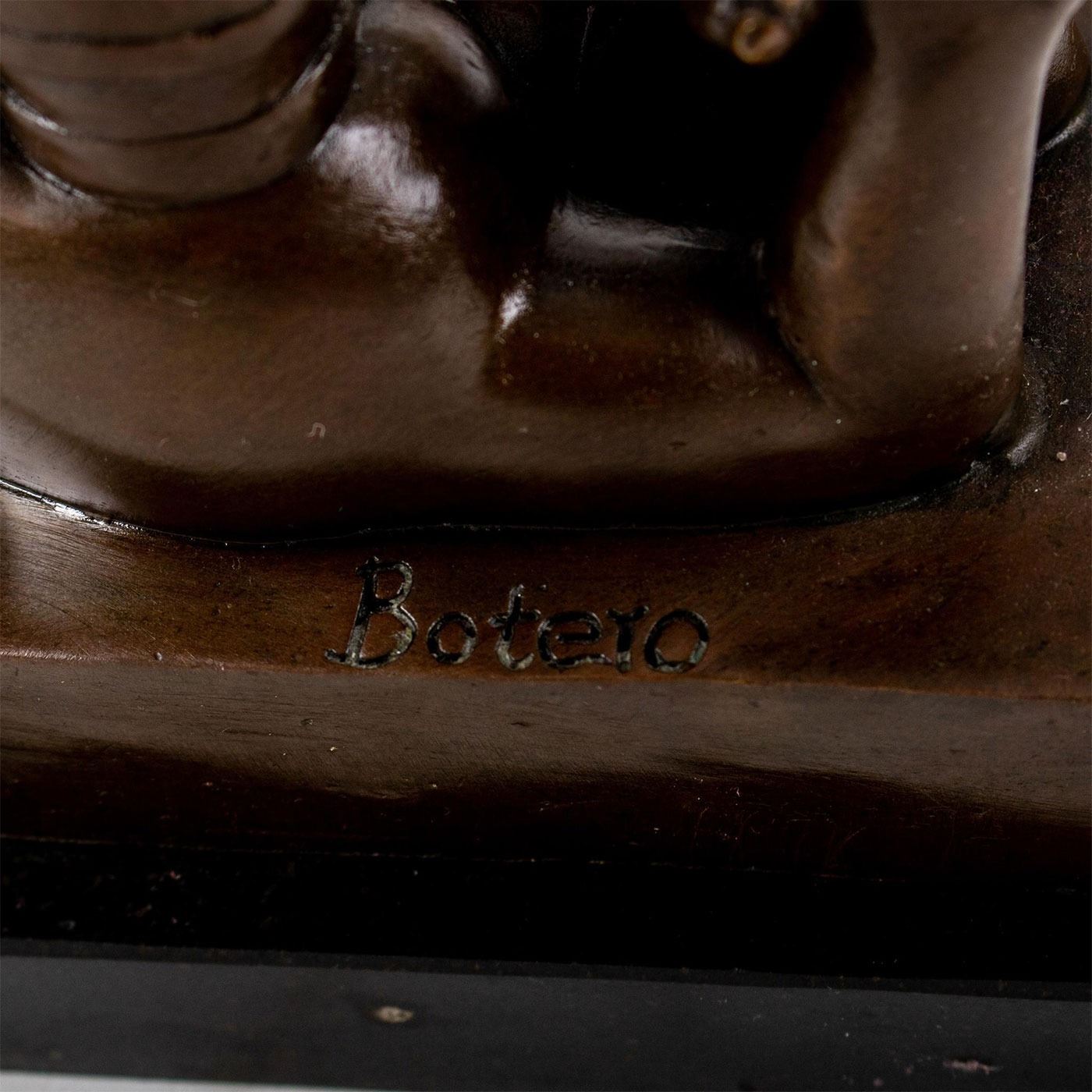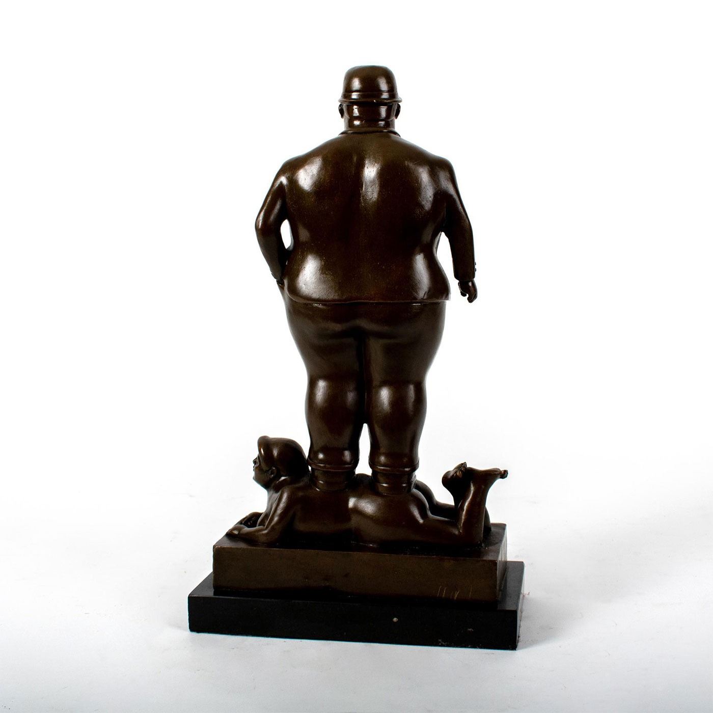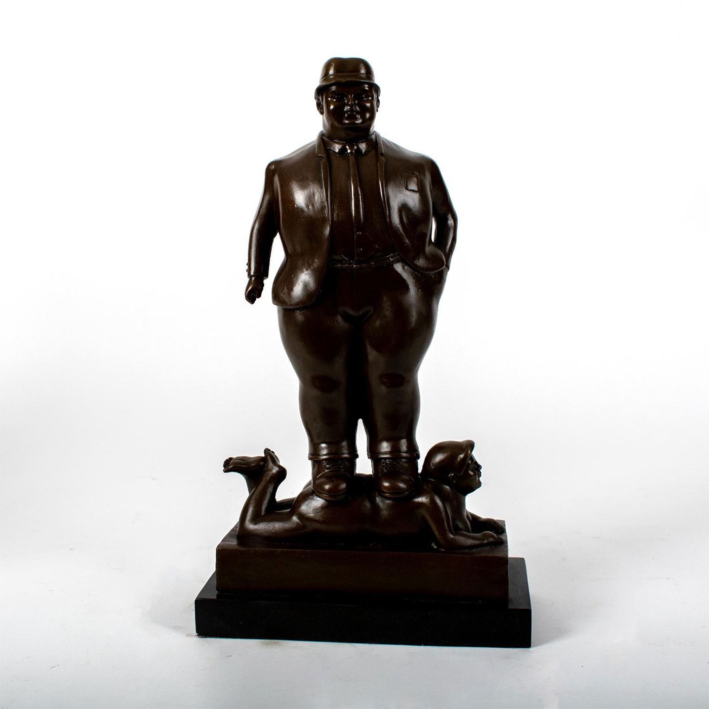 Hombre Sobre Mujer, Portly man standing on the back of a miniature portly woman. Mounted on a solid base of glossy polished marble. Artist Signed Botero on top of base. Fernando Botero, figurative artist and sculptor, born in Medellin. His signature style, also known as "Boterismo", depicts people and figures in large, exaggerated volume, which can represent political criticism or humor, depending on the piece. 26lbs. Signature/Marking Location: Bronze base Material/Technique: In Artist's Hand Medium: Bronze