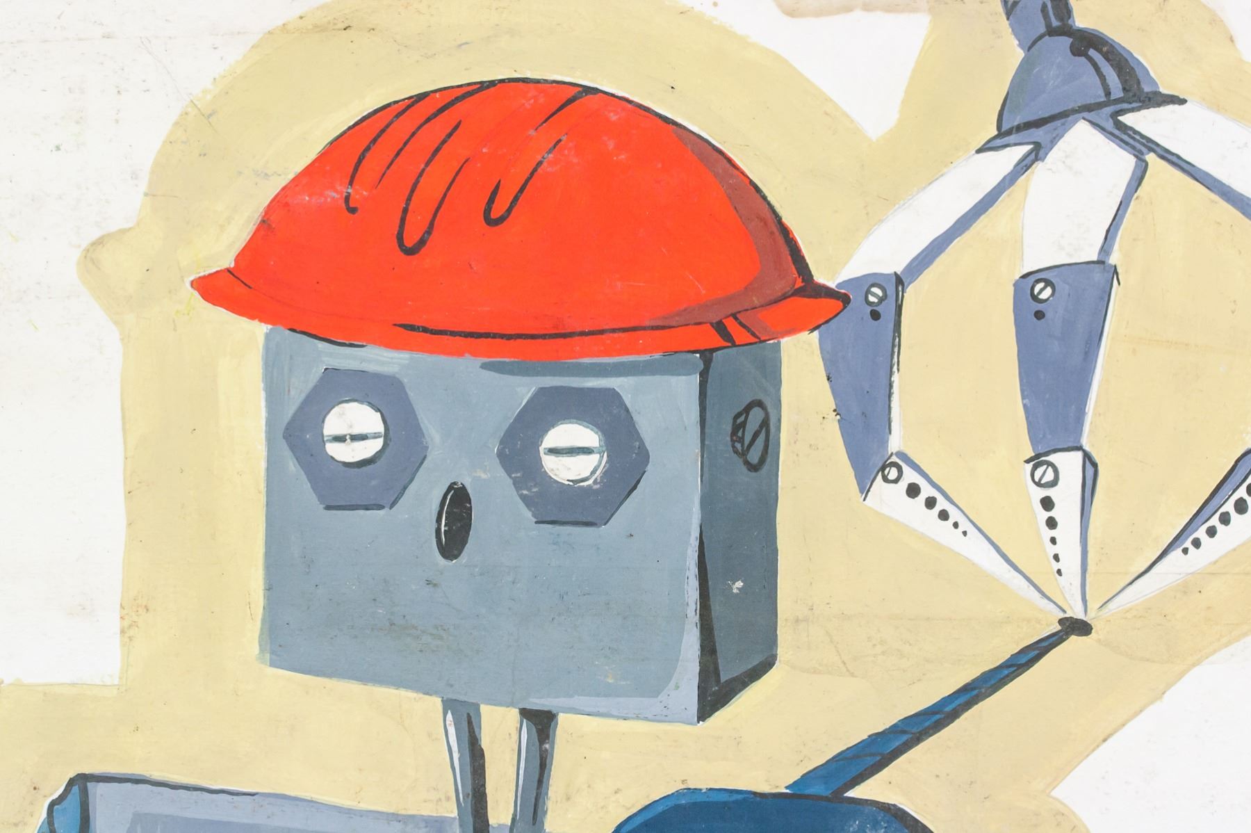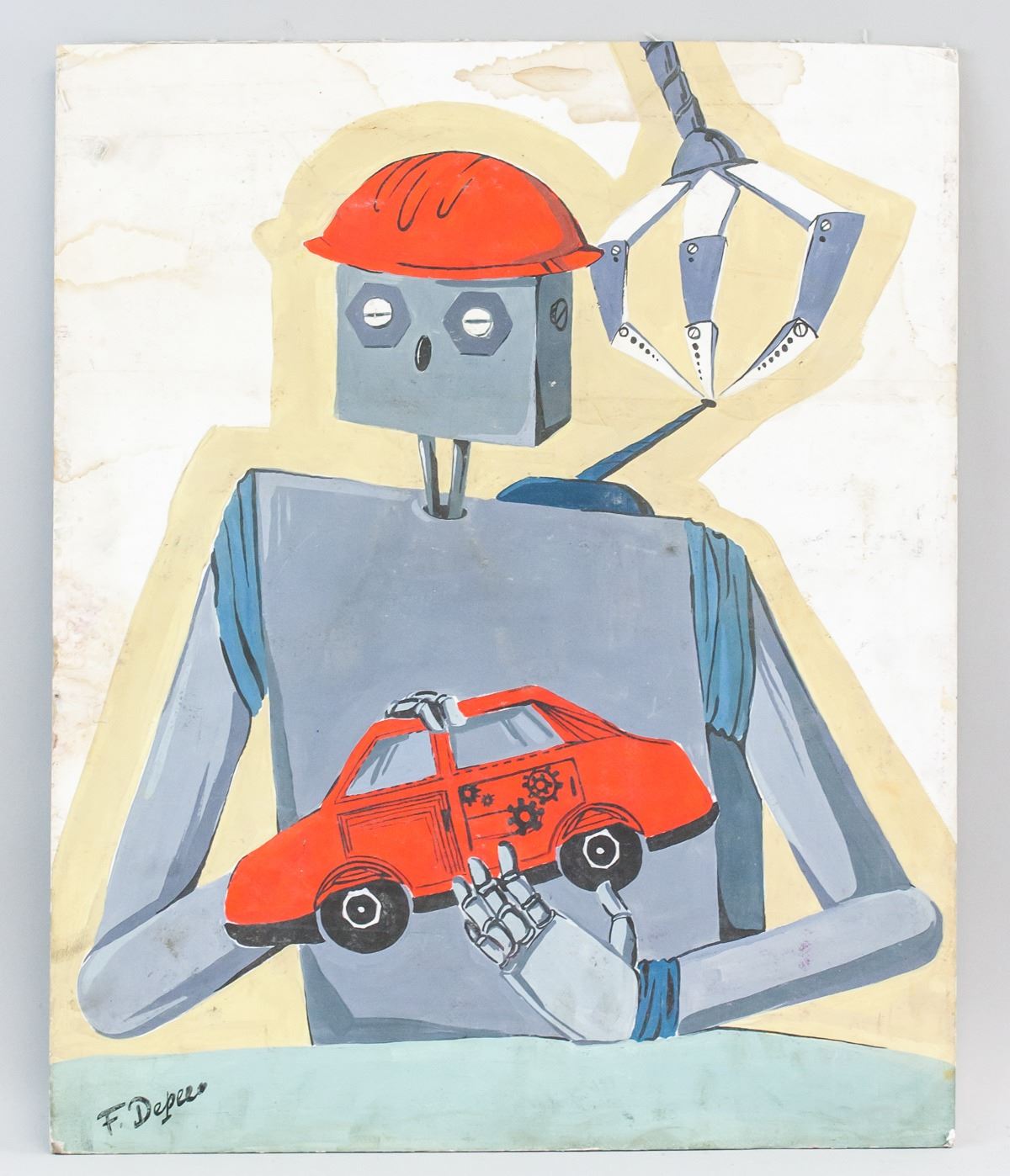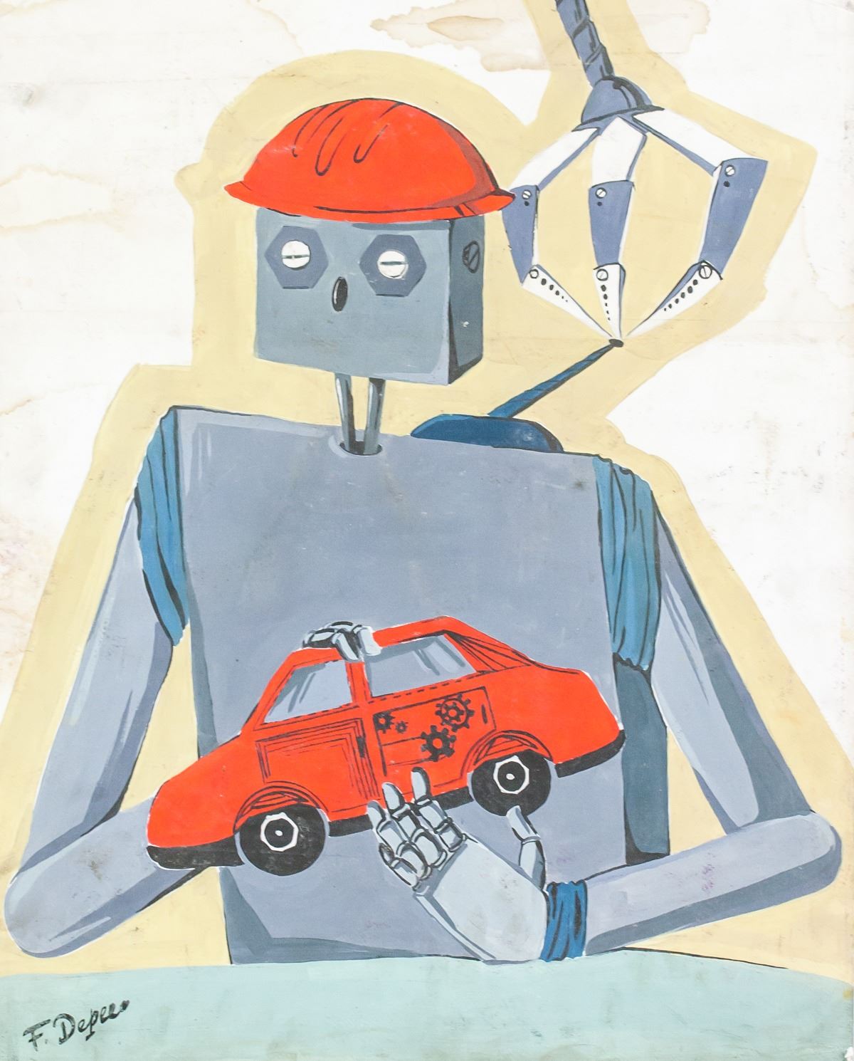 Gouache on board. Featuring futurist composition of a robot wearing a red hardhat holding a red car. Signed "F. Depero" in the bottom left corner. Attributed to Fernando Depero (1913-1950, Italian). 61 x 50 cm (24 x 19.5 inch). Provenance: This lot carries limited provenance from a Southern Ontario estate