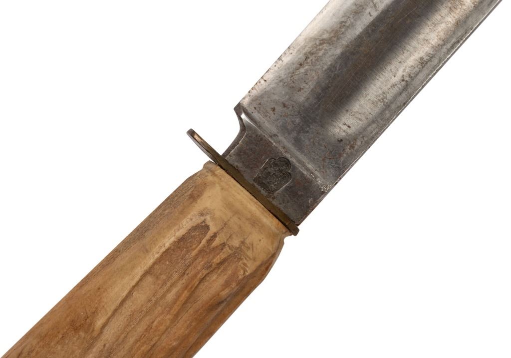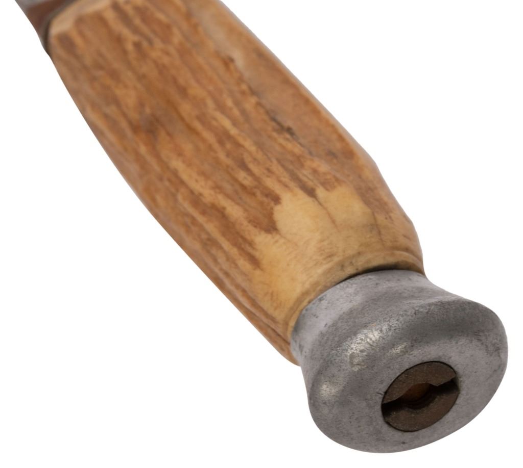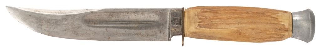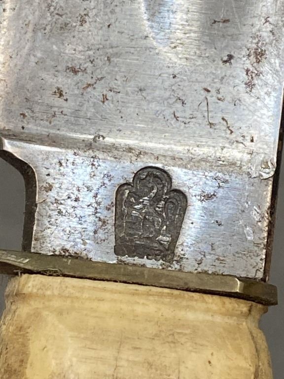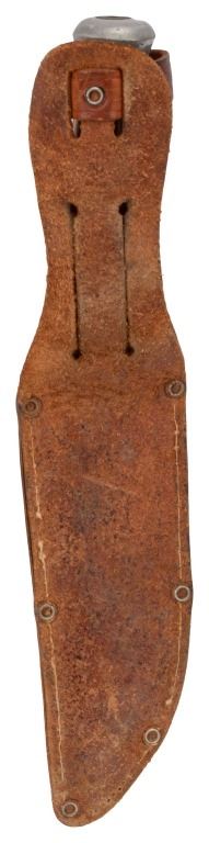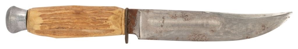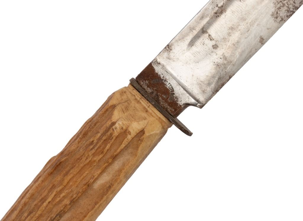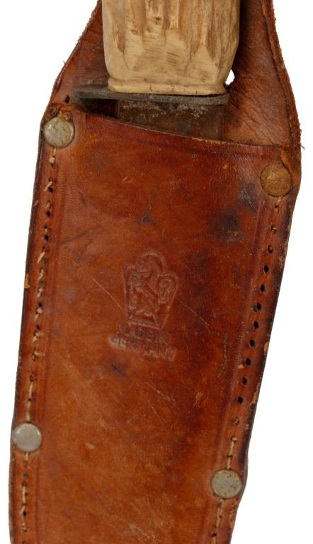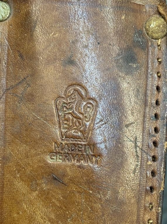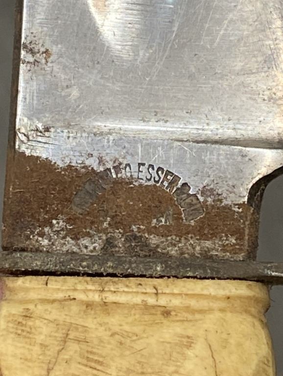 Item/Description: German Fernando Esser & CIA Solingen knife. Fixed blade sheath knife with stag / antler handle. Horse makers mark to one side, Fernando Esser & CIA to the other. Horse hallmark also imprinted to front of leather sheath. Aluminum pommel / endcap is loose but attached (can be slightly turned).