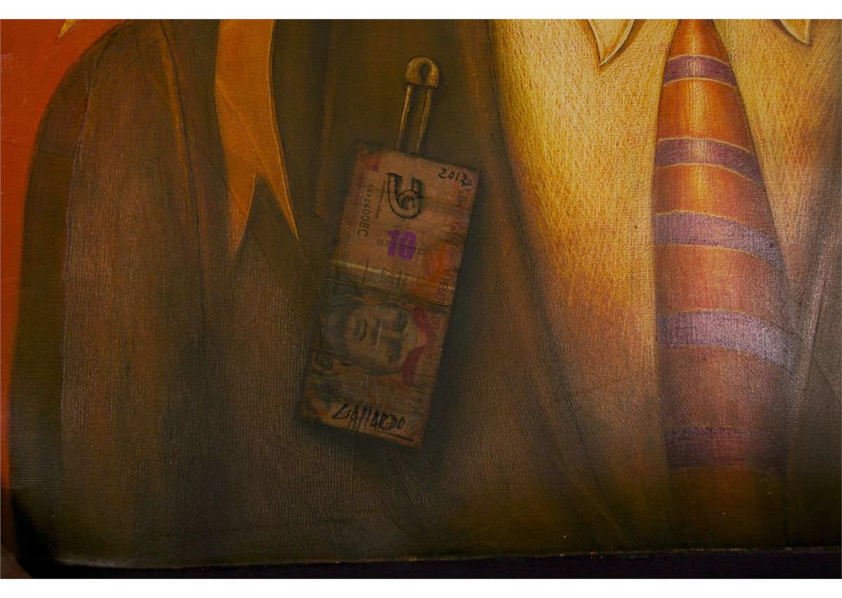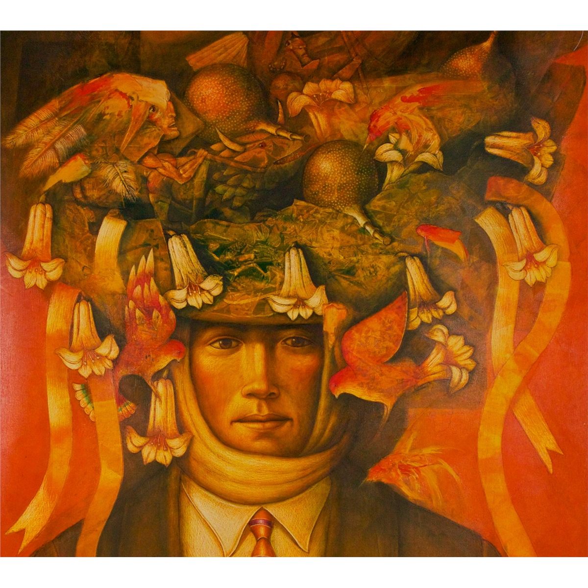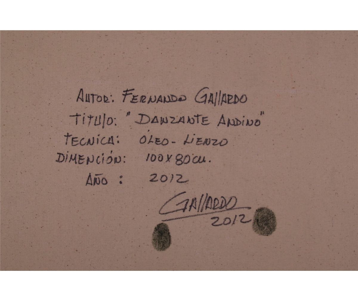 Fernando Gallardo, (Peruvian 20th Century), "Danzante Andino", oil mixed media on canvas. Accompanied with a Certificate of Authenticity with signature and thumbprint from artist and a photo of artist holding this one of a kind original painting. (Unframed). [< 5(lbs), 39.5(in),31.5(in),