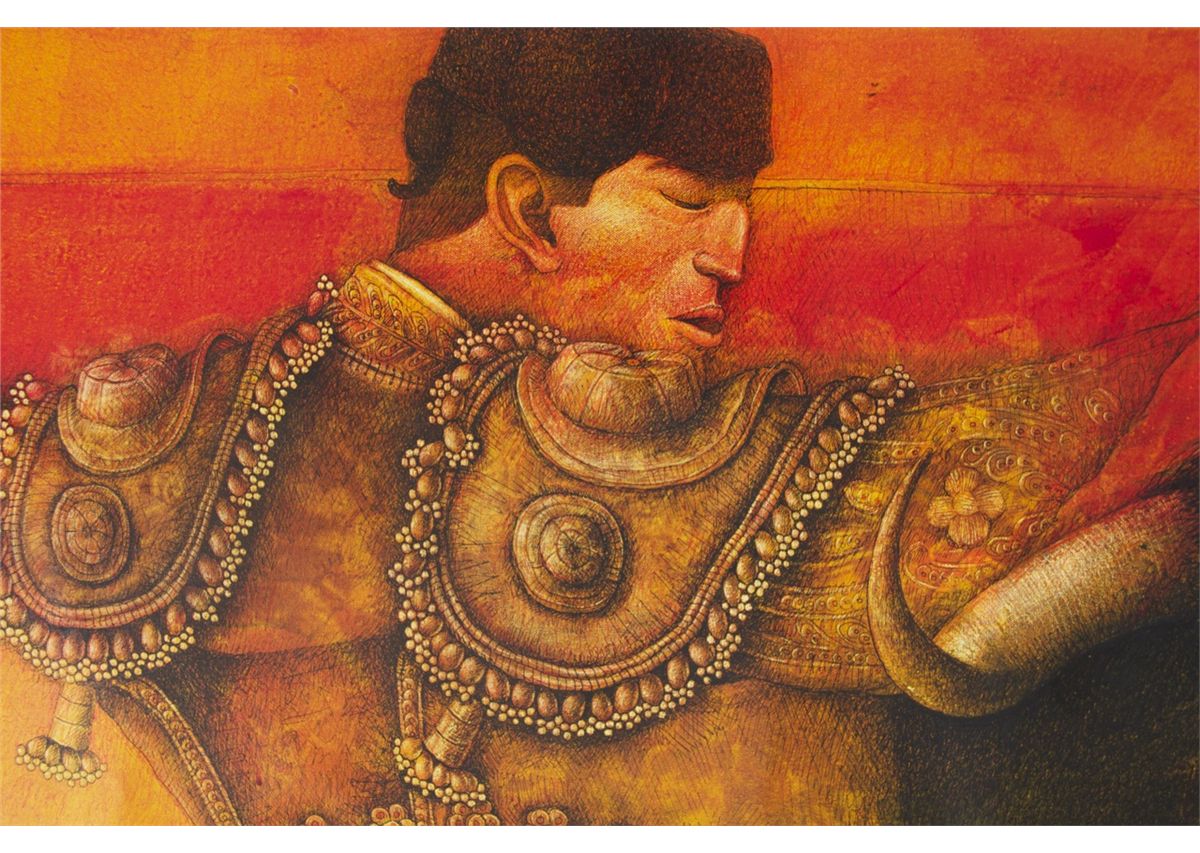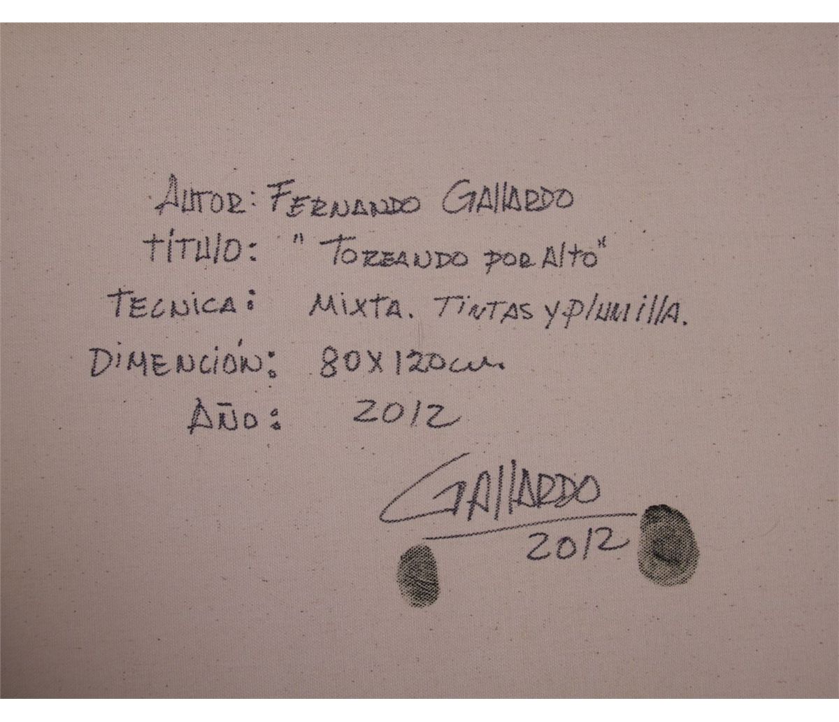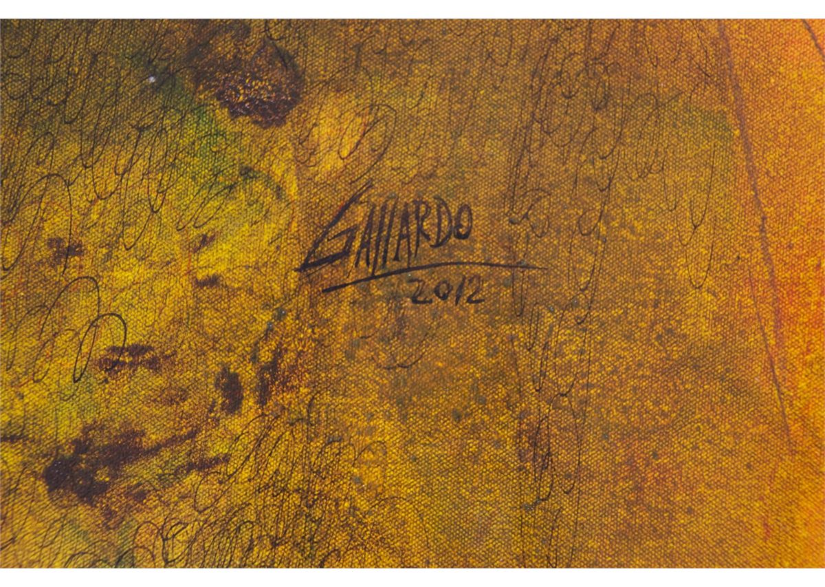 Fernando Gallardo, (Peruvian 20th Century), "Toreando Por Alto", oil mixed media on canvas. Accompanied with a Certificate of Authenticity with signature and thumbprint from artist and a photo of artist holding this one of a kind original painting. (Unframed). [< 5(lbs), 31.5(in),47(in),
