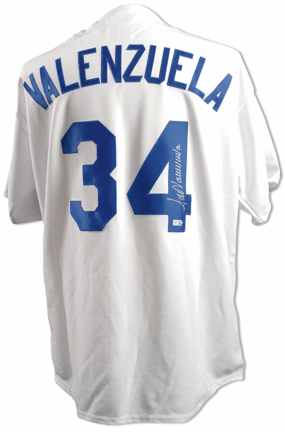 Official Majestic replica Los Angeles Dodgers baseball jersey, with sewn on letters and numbers, signed in silver ink on the number on the back. In fine condition, with a Major League Baseball hologram affixed to number.