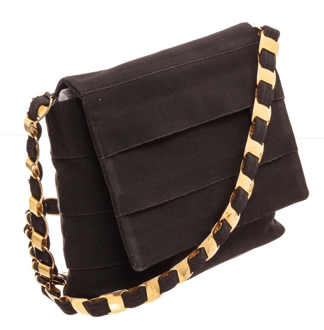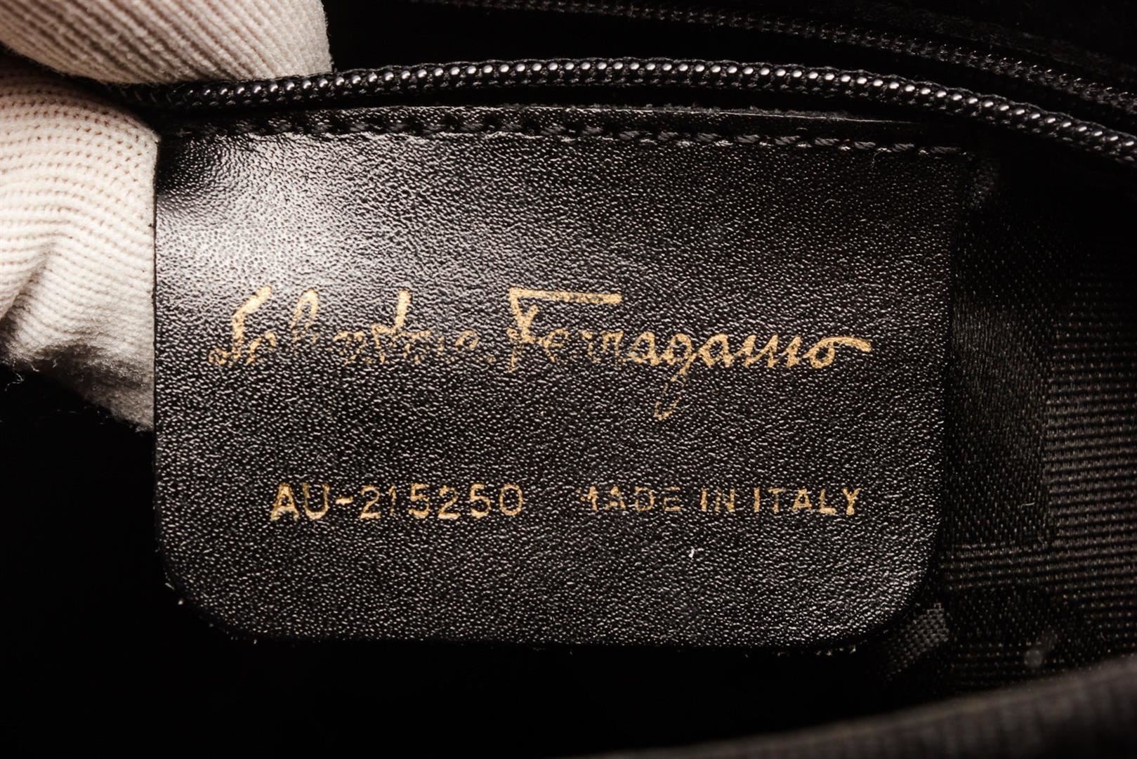 Ferragamo Black Canvas Chain Shoulder Bag with silver-tone hardware, single shoulder straps, snap closure at front closure.
