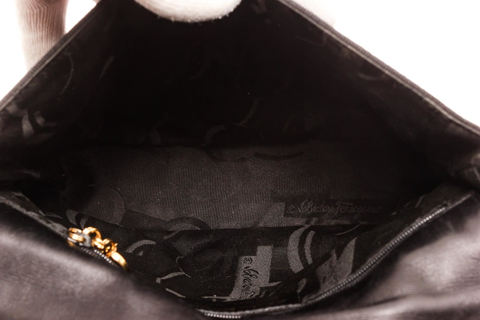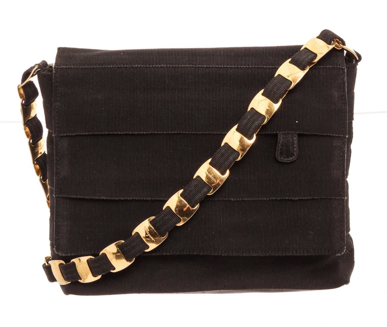 Ferragamo Black Canvas Chain Shoulder Bag with silver-tone hardware, single shoulder straps, snap closure at front closure.