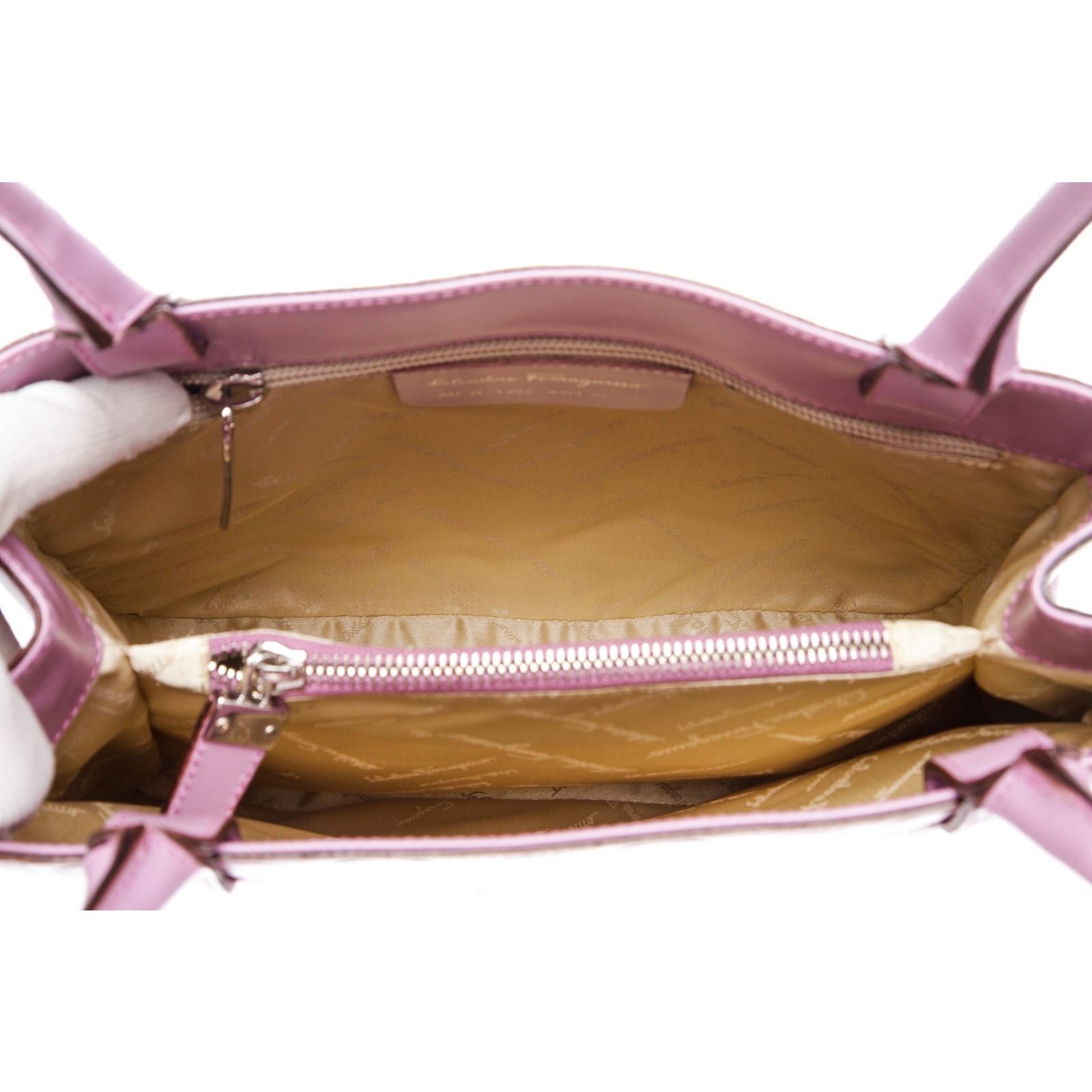 Description: Salvatore Ferragamo Purple Embossed Leather Shoulder Handbag. Crafted out of purple embossed leather, silver tone hardware, dual rolled shoulder straps. Inner beige fabric lining and side zip pocket.
