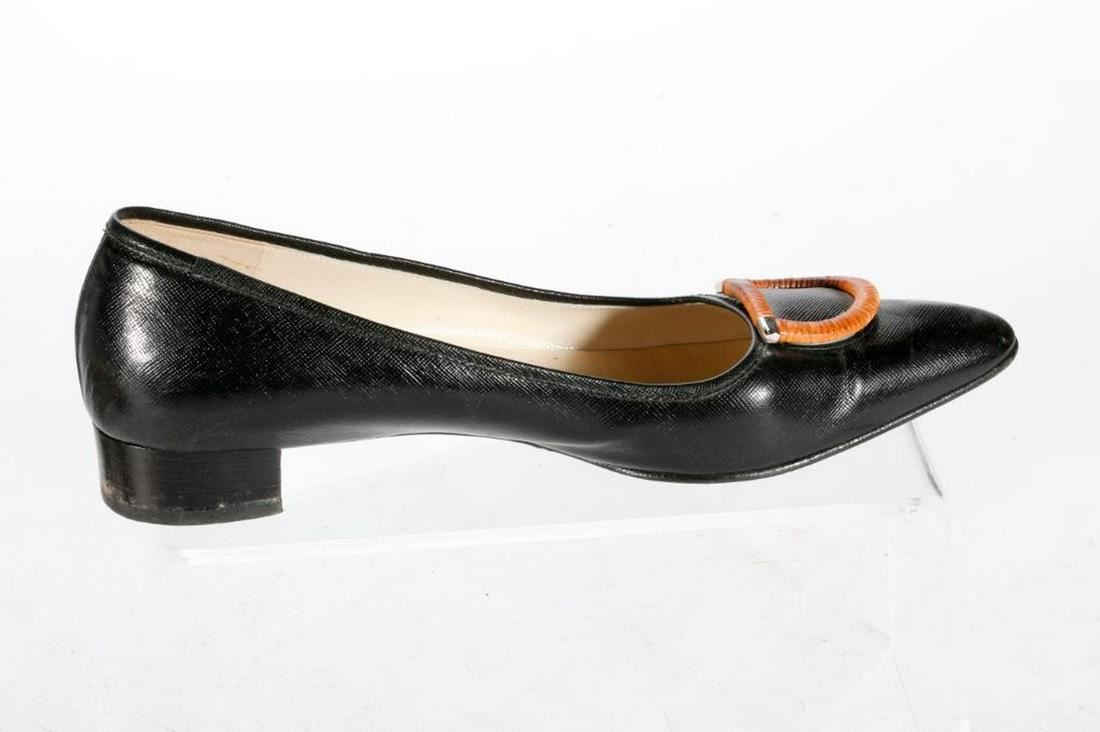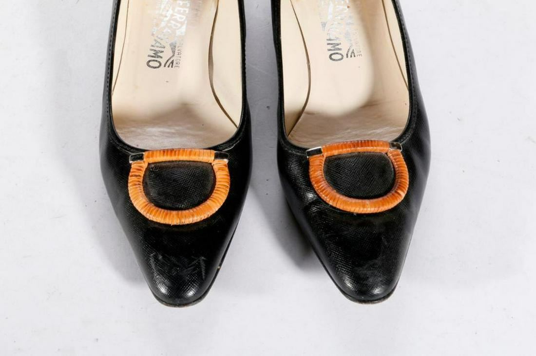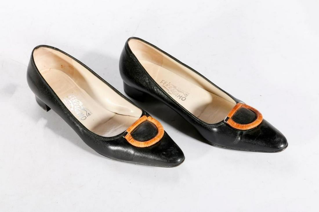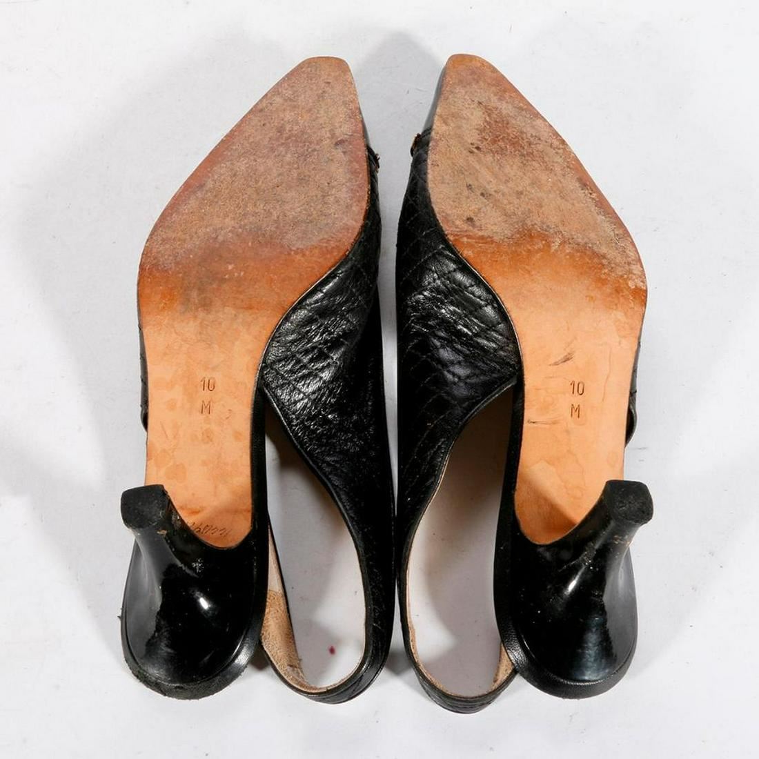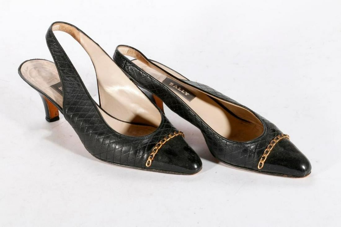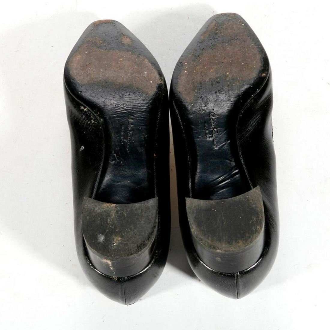 Two pairs of Ferragamo: (1) black toe shoe (US size 10 B). (2) Black patent leathe shoes with buckle. Bally quilted black leather slingback shoes with black patent toe (US size 10 M) Items are sold as is. Please inquire about condition if not otherwise stated.