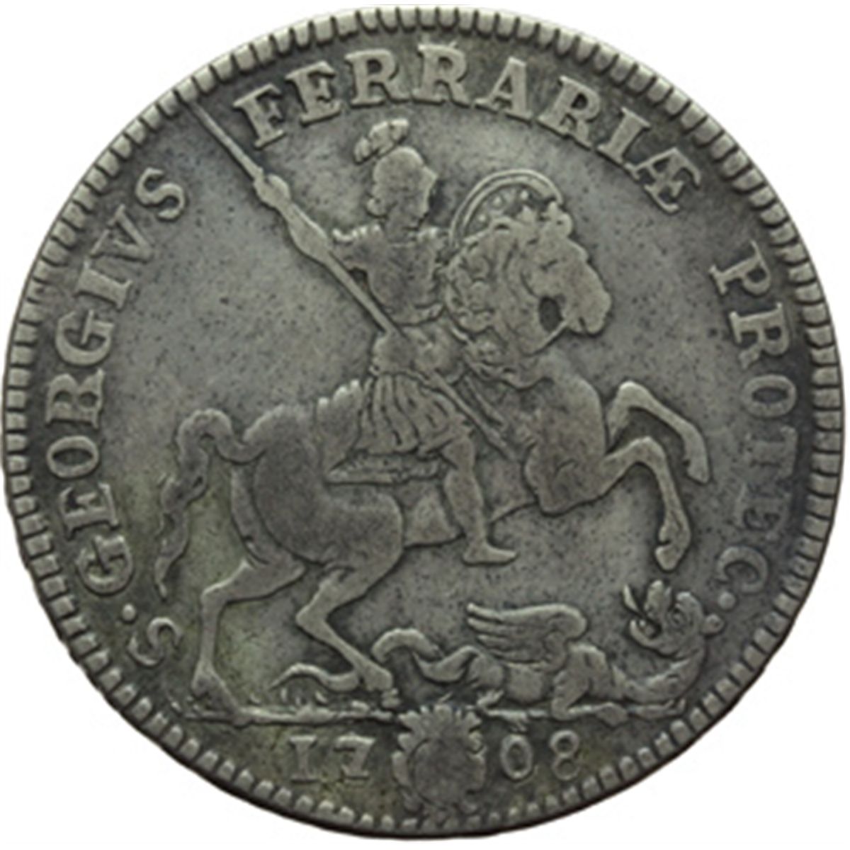 Monete e Medaglie di Zecche Italiane. Ferrara. Clemente XI (1700-1721). Piastra 1708, A. VIII. M. 227. Berm. 2476. CNI 1. AG. g. 29.32 Inc. Bartolomeo Cotel. RRR. BB.