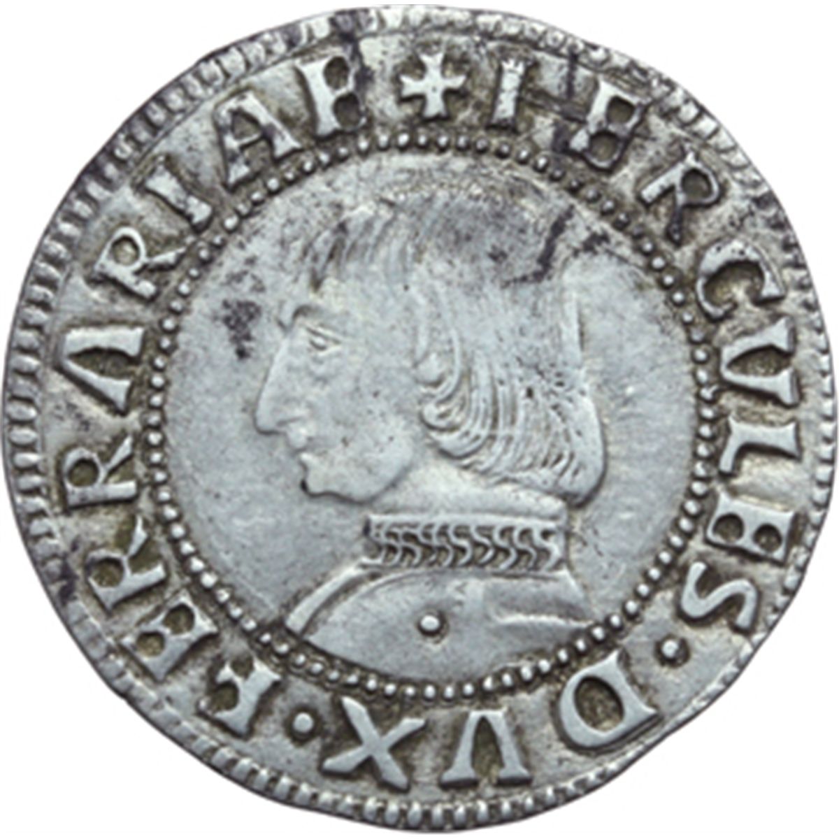 Monete e Medaglie di Zecche Italiane. Ferrara. Ercole I d'Este (1471-1505). Grossone. D/ Busto corazzato a sinistra. R/ S. Giorgio a cavallo trafigge il drago. MIR 257. AG. qSPL.