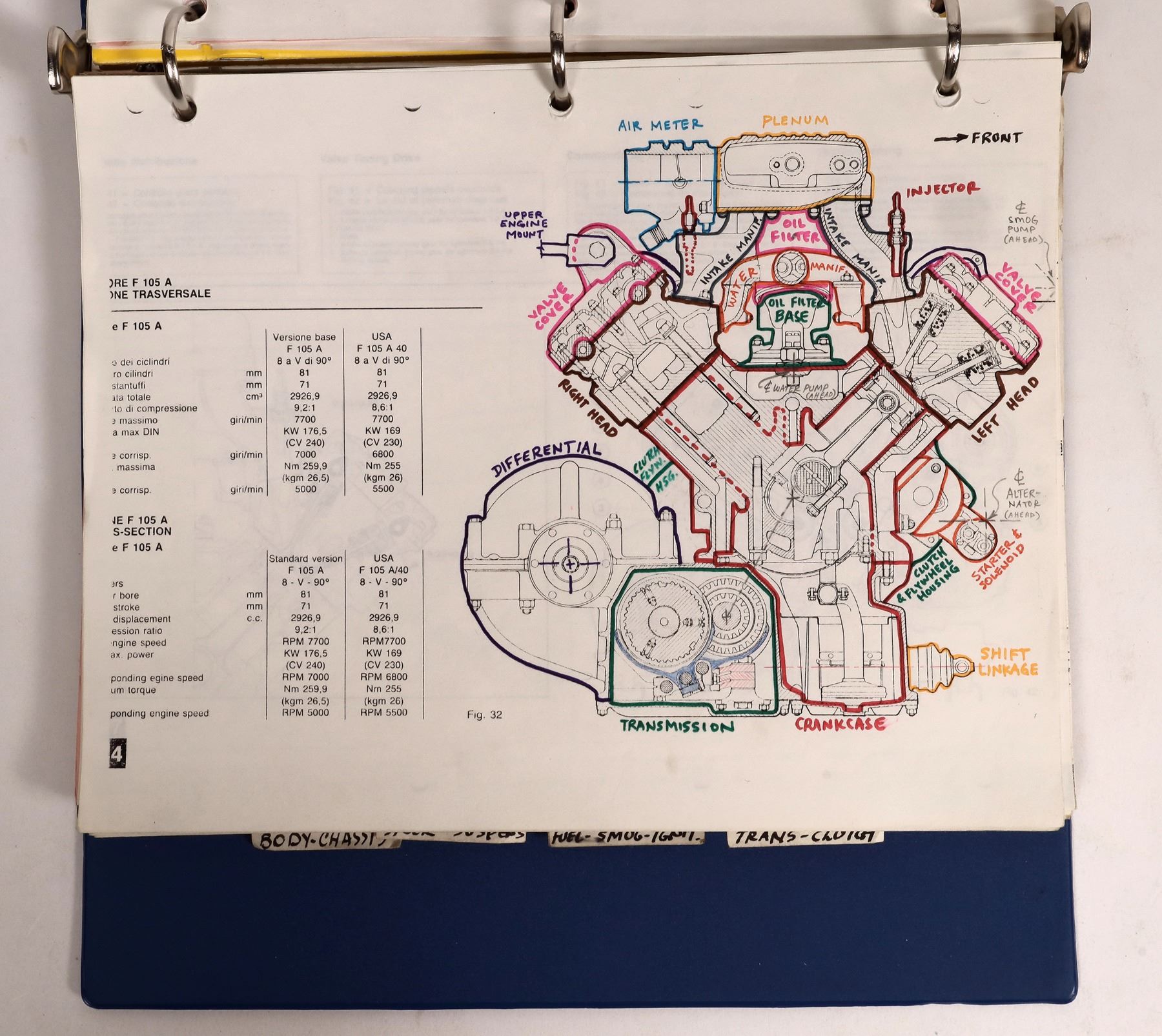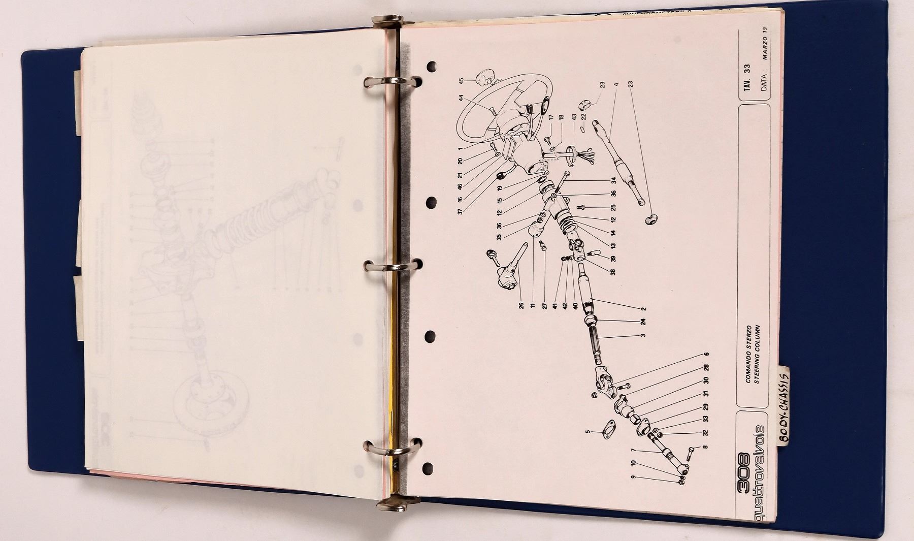 This book is an unofficial assembly manual for the 308 Ferrari Quatrovolve auto. It appears to have been assembled by an owner or technician to better understand the functions of individual systems; air conditioning, engine, driveline, transmission, injection system, etc. There are no parts identification pages. A good reference book for first time Ferrari owners of the 308.