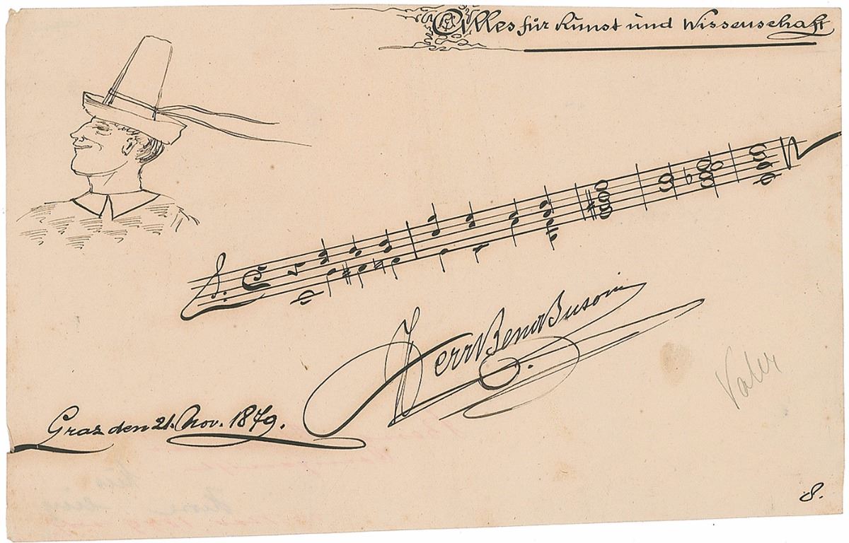 Important Italian composer, pianist, and conductor (1866–1924) best known for his complex contrapuntal keyboard works. Desirable AMQS and sketch on an off-white 8.5 x 5.25 sheet, signed “Ferr. Benv. Busoni, Graz, 21. Nov. 1849.” Busoni pens five bars of music and sketches a character in profile, in addition to a brief quote in German (translated): "All for art and science.” In fine condition, with light soiling.
