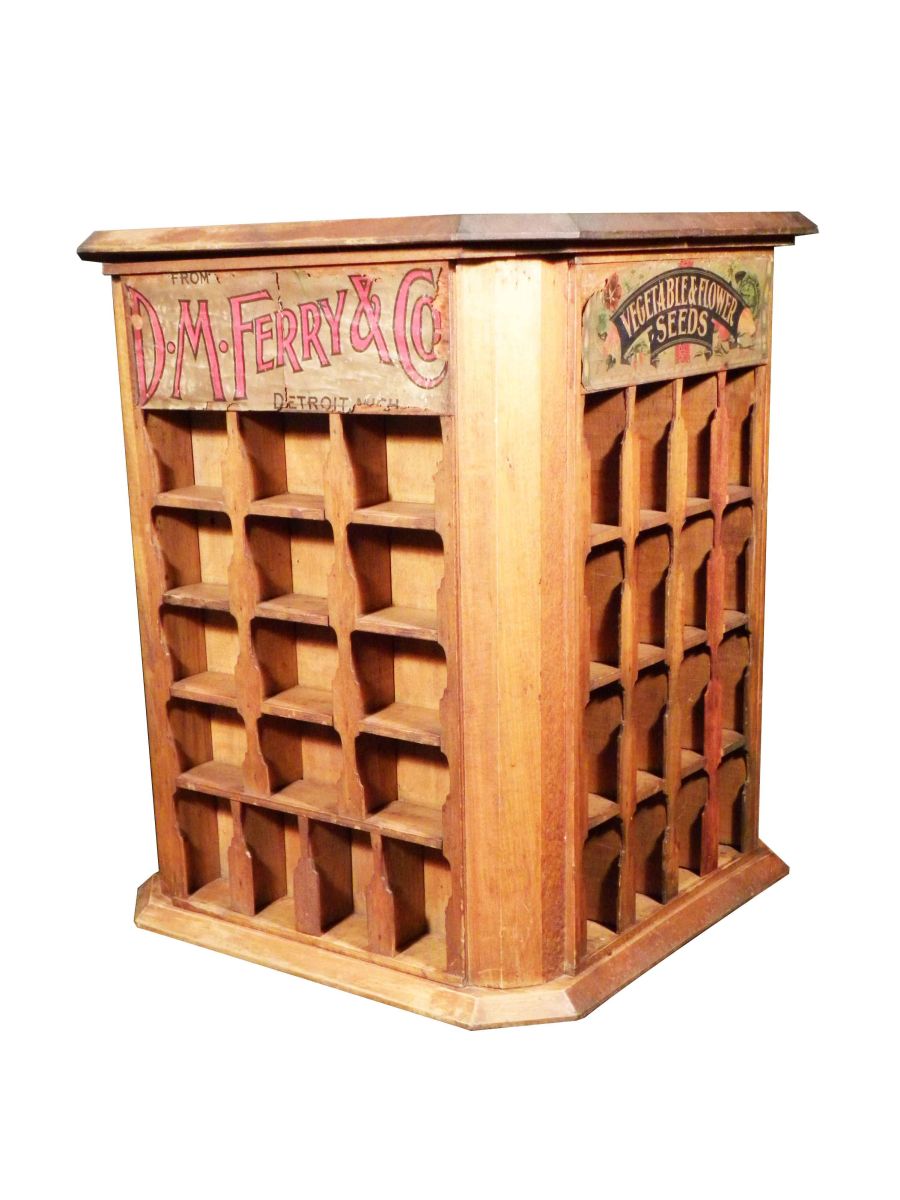 Ferry Counter-top Rotating Seed Display and Storage. Top flips open for stock. 2 of the 4 original decals still intact, good original condition. 18 1/2 inches square X 27 1/2 inches tall.