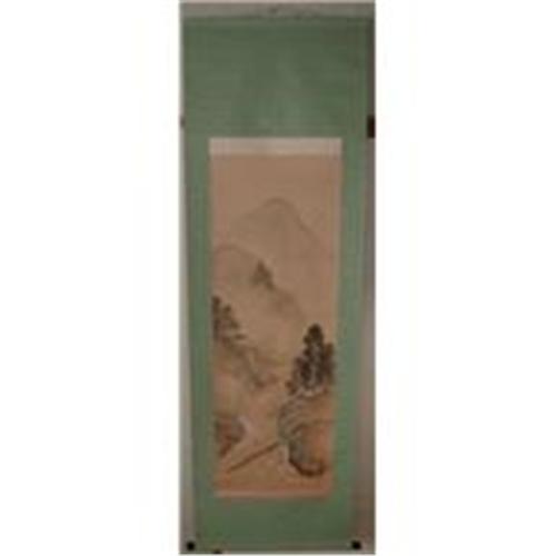Shunzan makes beautiful and sparing use of gofun, a white pigment made from clam shells, to add to the sense of motion the ferry driver gives to the lovely river that runs through these heart-achingly beautiful mountains. Mount: 67 x 21 inches, 170 x 53 cm. Painting: 42.5 x 15 inches, 108 x 38 cm