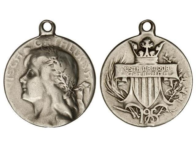 Festa Nacional Catalana. 1905. CATALUNYA. Anv.: Busto de Alegoría a izquierda, encima VISCA CATALUNYA. Rev.: Armas catalanas coronadas, entre laurel y palma. AR. Ø 26 mm. Con anilla. Cru.M-992 var. MBC.
