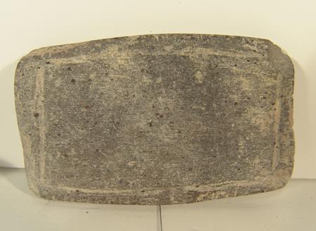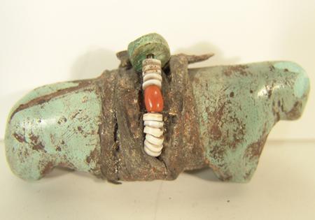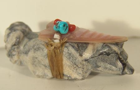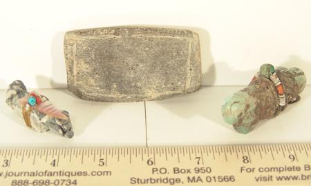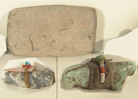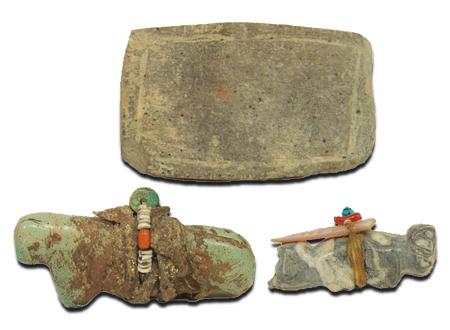 The larger bear a dark stone with string wrap and red powder, the smaller bear made of pipestone - plus a pigment stone palette with etched linear border. Palette approximately 4"