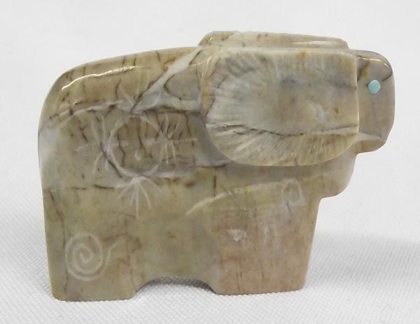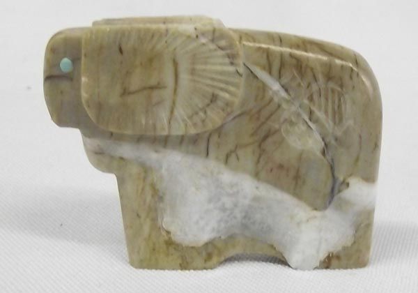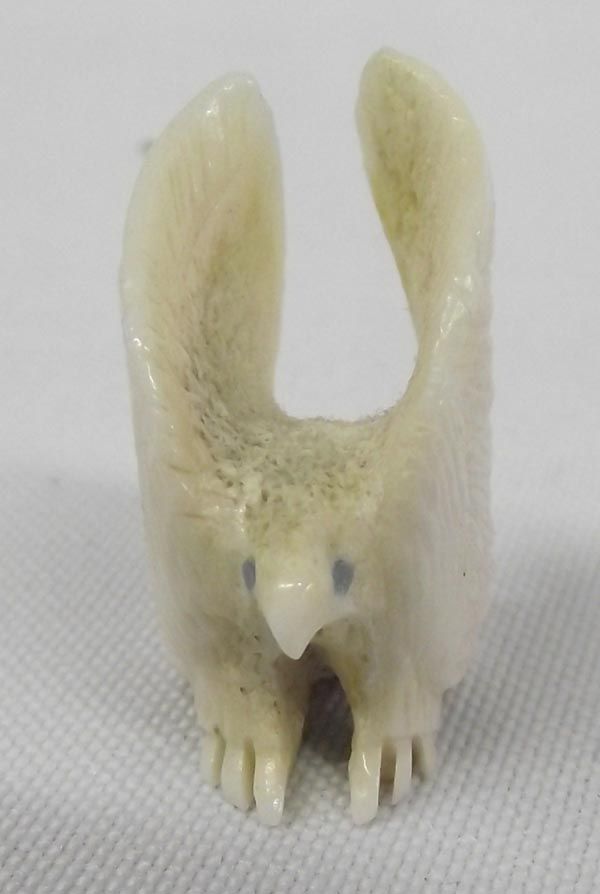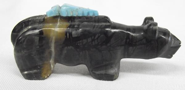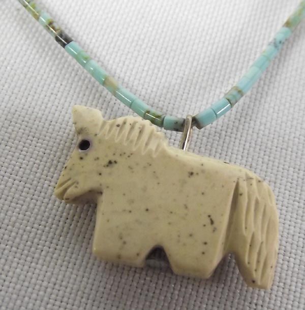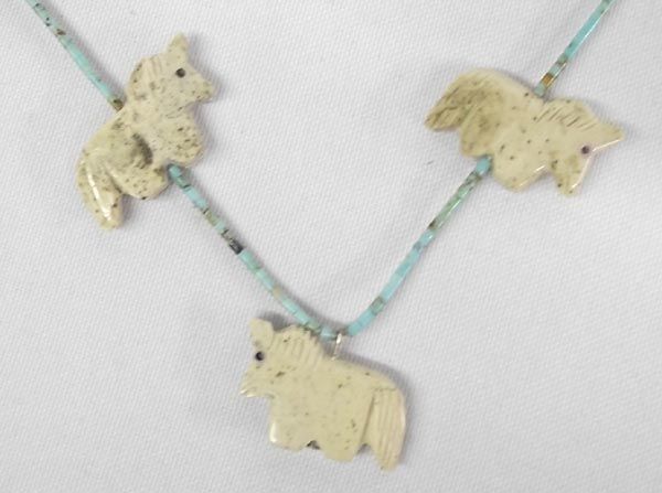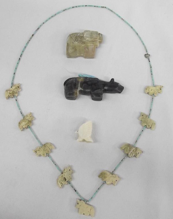 Fetish Necklace & Three Fetishes. Horse fetish necklace, nine fetishes strung with small turquoise heishi beads. Measures 28'' and includes artist's sterling silver tag. The 3 fetishes include a) bear 1 1/4'' hi x 3 1/4'' long, turquoise power pack and turquoise eyes b) ram fetish, turquoise eyes, c) eagle fetish, bone with turquoise eyes.