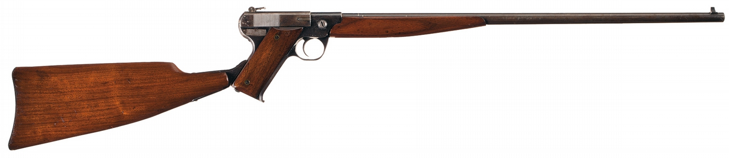 Produced for less than two years, the Fiala Target, also known as the Model 1920, was externally very similar to the Colt Woodsman, but internally quite different. The Fiala is magazine fed, but the semi-auto type slide is manually cycled for each shot. Fitted with a dovetail front sight and a folding notch peep rear sight on the slide. The left side of the frame is marked "FIALA ARMS" (traces remain) and the right side has the model marking over "MADE IN U.S.A." Smooth grips and forearm with screw-mounted walnut buttstock.