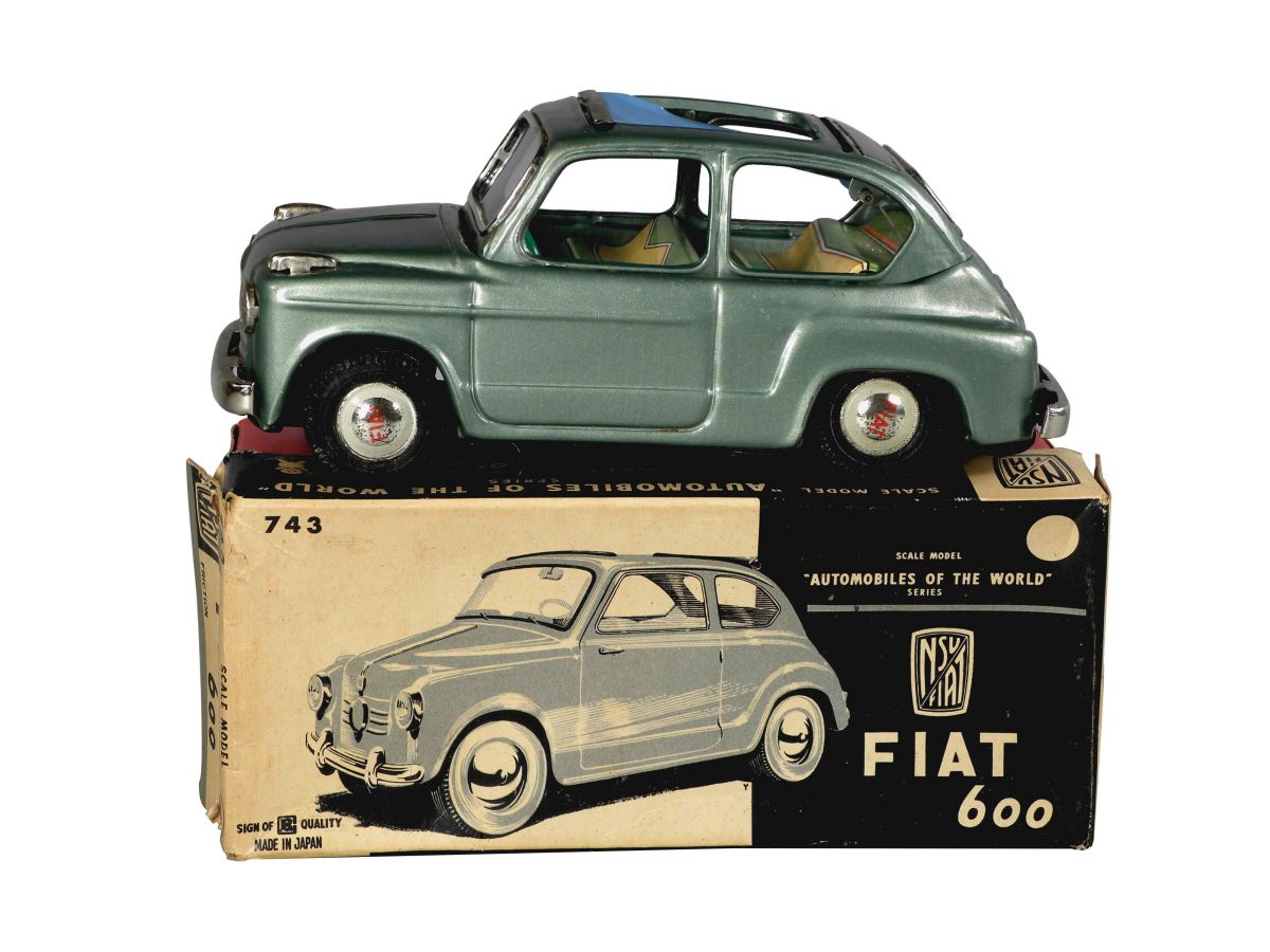 Fiat 600 Tin Toy in original box. Working friction power. Automobiles of the World Series #743, made in Japan. Both car and box in excellent condition. 7 inches long.