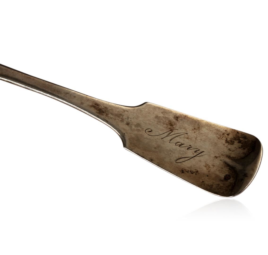 Antique coin silver salt/mustard spoon with shell bowl. Fiddle tip pattern by C A Burr, NY 1857-1863. Rare mono "Mary".