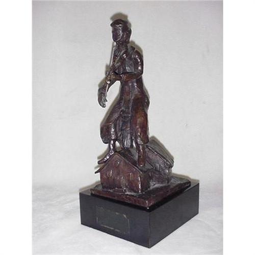 Bronze statue of "Fiddler on the Roof" Signed, "Wolf" #1/6. 18" tall x Base is 7" square. One of only six cast.