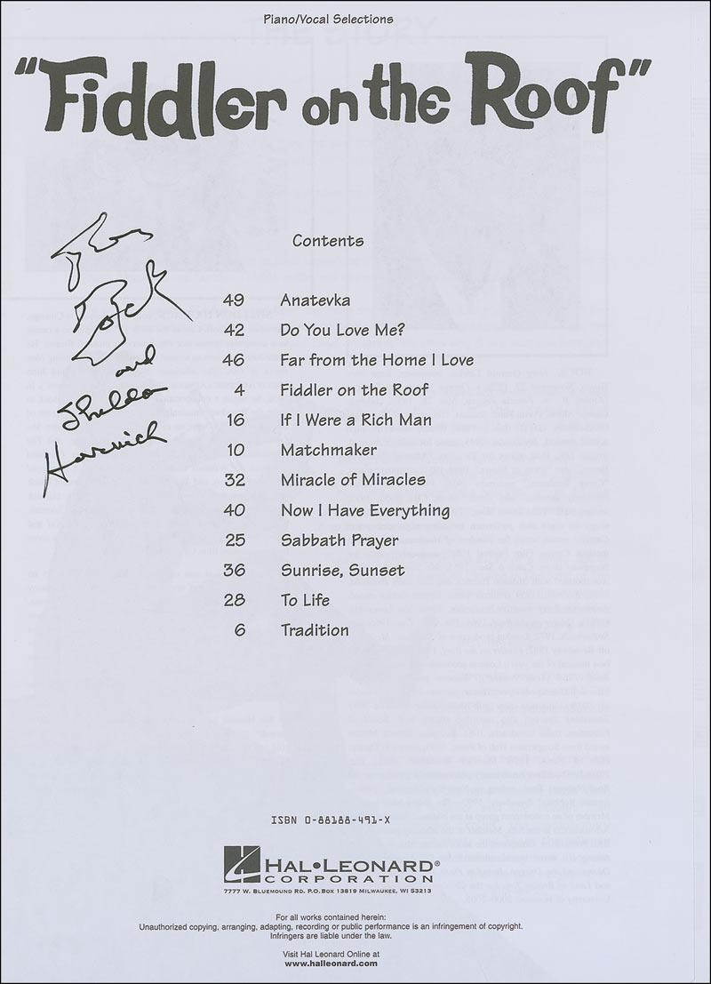 Fiddler On The Roof songbook, 9 x 12, 52 pages, signed in-person in black felt tip on the opening page by recently deceased Jerry Bock (music) and Sheldon Harnick (lyrics). In very fine condition. Originally obtained by in-person specialist Mike Wehrmann.