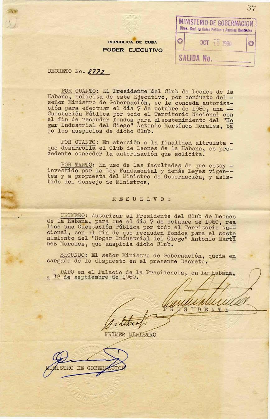 Rare document signed by Fidel Castro as Prime Minister, countersigned by President Osvaldo Torrado and dated 19 October 1960. Document is an early Cuban order on official ''Republica de Cuba / Presidencia'' letterhead with three blindstamped seals of the Republica de Cuba and the Ministerio de Hacienda. Document, measuring 8'' x 12.25'', has light foxing and a staple mark to left edge, otherwise very good condition.