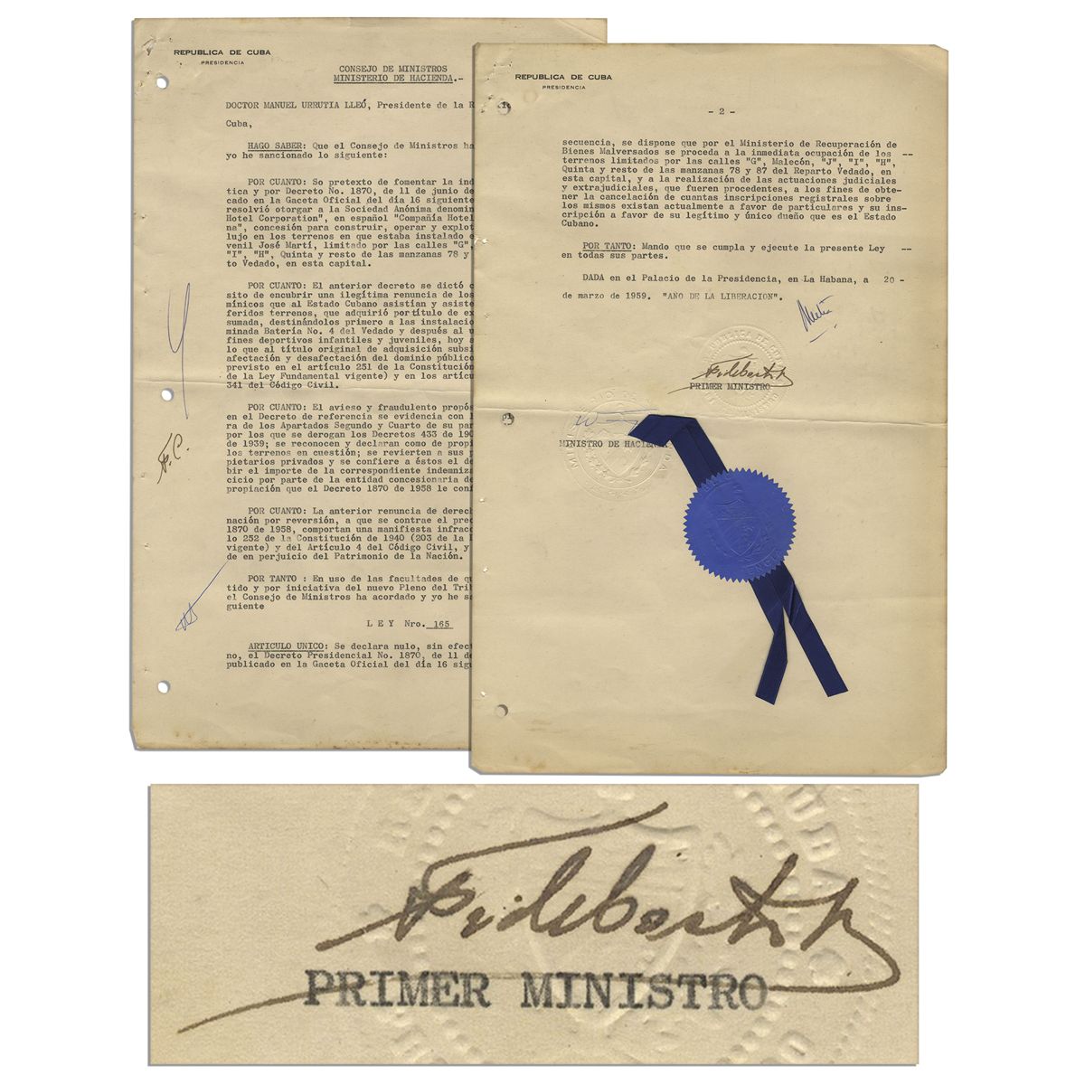 Official Cuban government document, signed both ''Fidel Castro'' as Prime Minister and initialed ''F.C.'' Typed document is a presidential decree, dated 20 March 1959 and typed upon stationery from ''Republica de Cuba / Presidencia''. Document in Spanish is untranslated and countersigned by Manuel Urrutia Lleo as president, a position he held for just six months. With presidential seal affixed near signatures. Full signature appears on the second page and initials appear on the first page; other initials on the first page are likely by Urrutia. 2pp. document measures 9'' x 13.75''. Toning, foxing to bottom edge of the first page, filing holes to left margins and staple punctures to upper left. Overall in very good plus condition.