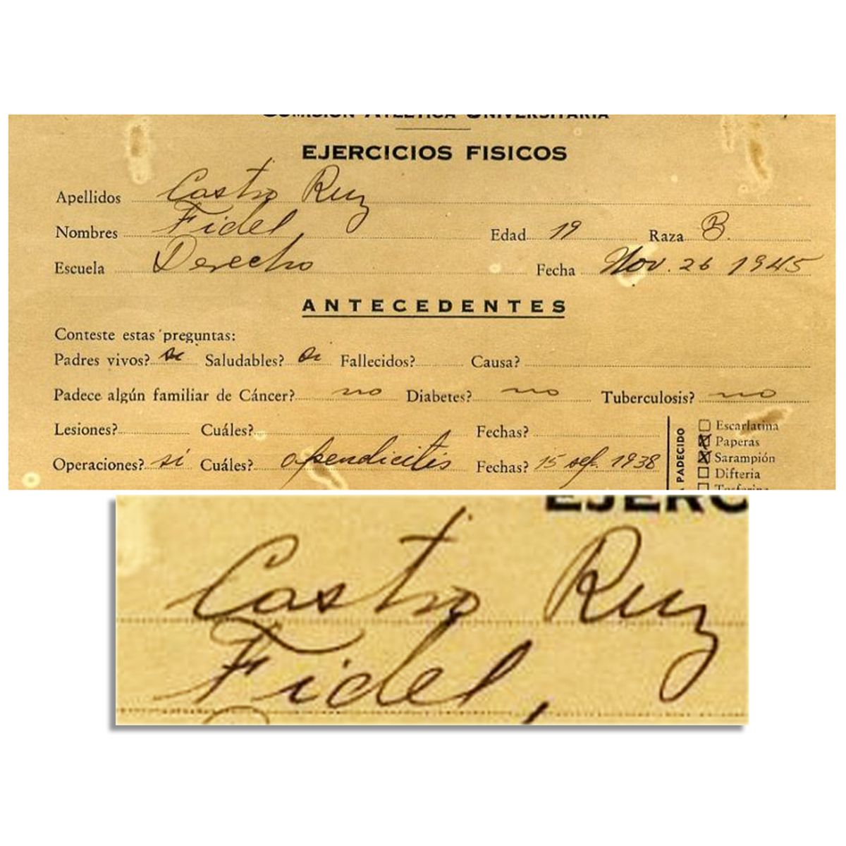 Unique Fidel Castro document signed, a University of Havana questionnaire dated 26 November 1945. Then a law student at the University of Havana, Castro completed this athletic questionnaire by hand in black ink, filling in personal information including his name and sports he played: ''…Basket. Track. Base-Ball…'' Other information includes his personal and family medical history, operations he had, his weight and height, etc. 2pp. document, front and verso, measures 8.5'' x 13''. In very good condition with some toning and foxing.