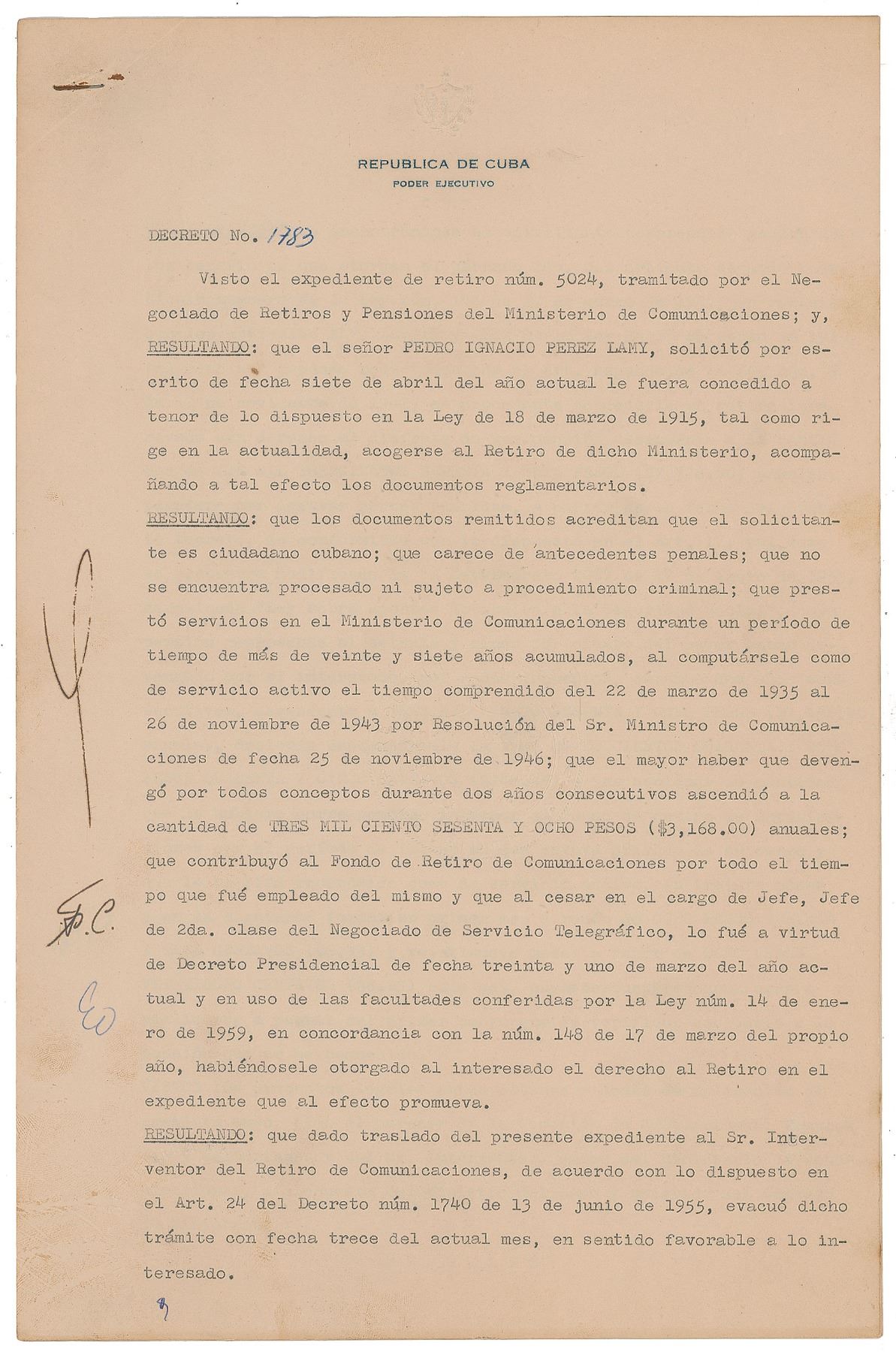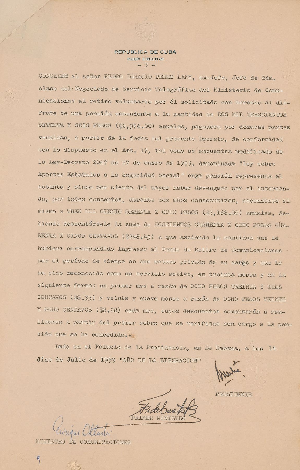 DS in Spanish, three pages, 8.5 x 13, July 14, 1959. Decree No. 1783, issued by Castro as prime minister of Cuba, which grants to Pedro Ignacio Perez Lamy (translated) "ex-boss, head of 2nd. class of the Telegraphic Service Bureau of the Ministry of Communications the voluntary withdrawal by the requested with the right to the enjoyment of a yearly pension amounting to the amount of two thousand three hundred and seventy-six national pesos ($2,376.00)." Signed at the conclusion in ink by Prime Minister Fidel Castro, President Manuel Urrutia Lleó, and Minister of Communications Enrique Oltuski. Castro signs his initials in the left margin of the two preceding pages. In fine condition.
