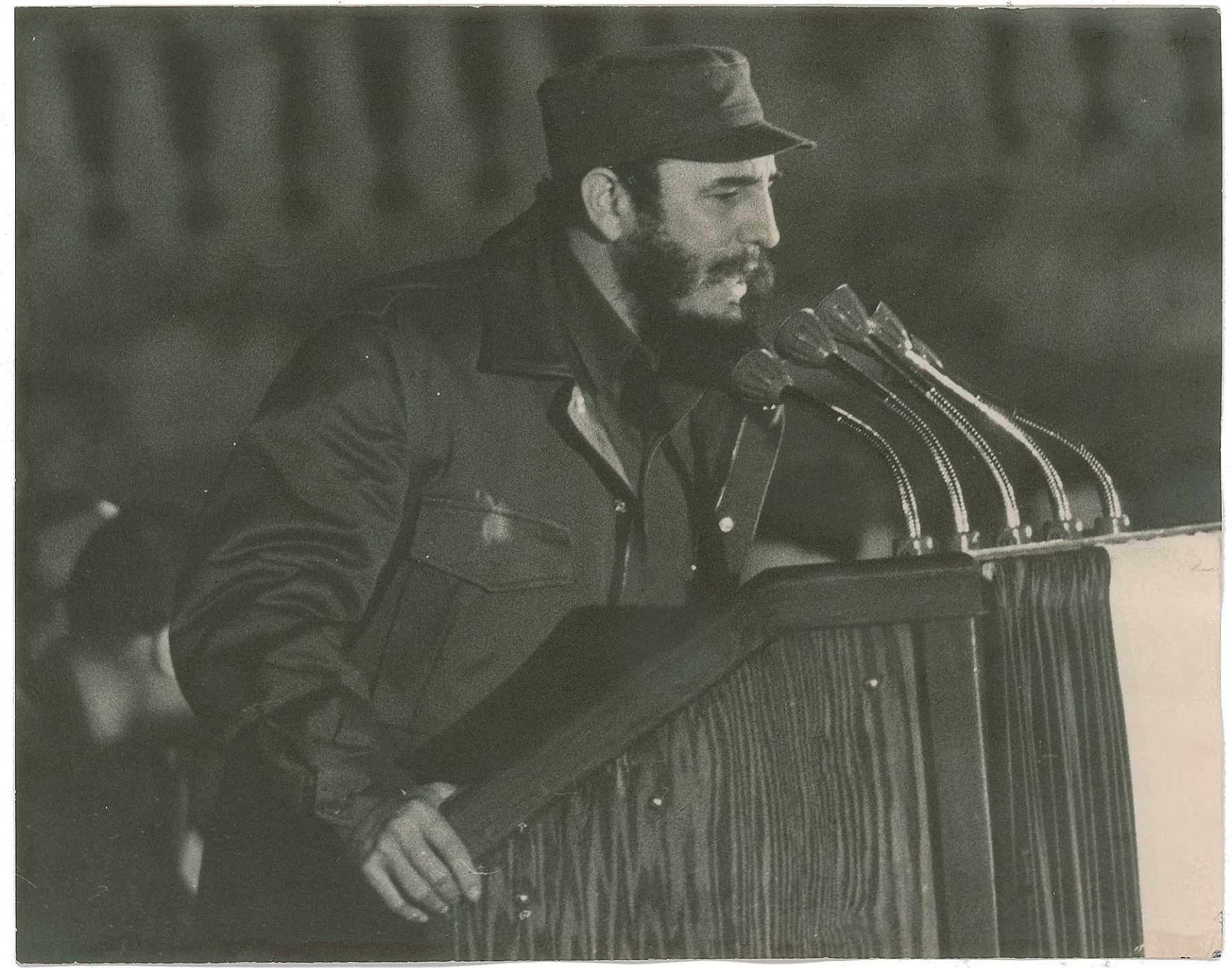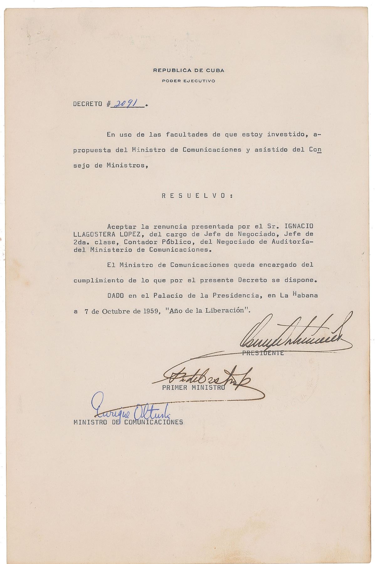 DS in Spanish, one page, 8.5 x 13, October 7, 1959. Official decree accepting the resignation presented "by Mr. Ignacio Llagostera Lopez, from the position of Head of the Bureau, Head of 2nd class, Public Accountant, from the Audit Bureau of the Minister of Communications." Boldly signed at the conclusion by Prime Minister Fidel Castro, President Osvaldo Dorticos Torrados, and Minister of Communications Enrique Oltuski. In very good to fine condition, with some light creasing. Accompanied by an unsigned original vintage matte-finish 10 x 8 photo of Castro at a podium.